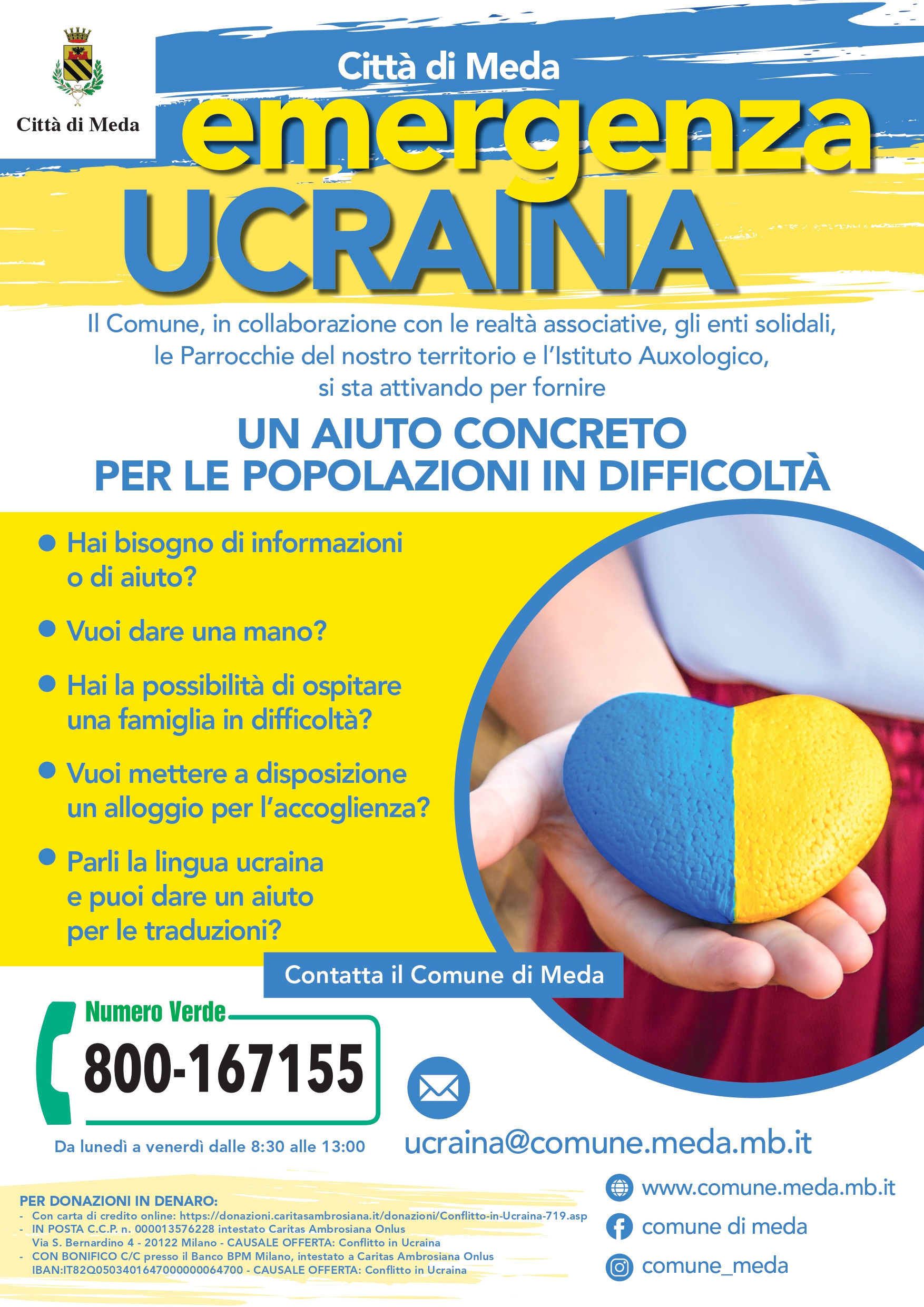 Мерія міста Меда, з співробітництвом з асоціаціями, з добровільними об´єднаннями, з церквами нашої території, а також з Інститутом Auxologico, активується заради конкретної допомоги для населення України, що через збройний конфлікт з Росією ,приїхали до Італії.Для інформації чи допомоги, для тих, хто має бажання приютити сім´ю в труднощах, або надати житло ,або має можливість допомогти з перекладом, необхідно зателефонувати в мерію м.Меда за номером 800.167.155( з понеділка по п´ятницю з 8.30 до 13.00 ) або написати на електронну адресу ucraina@comune.meda.mi.it. Біженці з України,прибувші на територію через надзвичайну ситуацію, будуть вважатися легалізованими на три місяці. У всякому разі , на протязі восьми днів з прибуття, необхідно вислати на адрес PEC Еміграційного Офісу Квестури Декларацію про присутність, прикріпивши ксерокопію паспорту. Крім того, особи, що надають притулок повинні до 48 годин від прибуття біженців вислати також Декларацію про гостинність. Можна завантажити необхідні модулі на даній сторінці. За допомогою для висилання документів до квестури чи за допомогою при заповненні документів , можна звертатися до місцевої поліції Polizia Locale( tel.0362.342074)