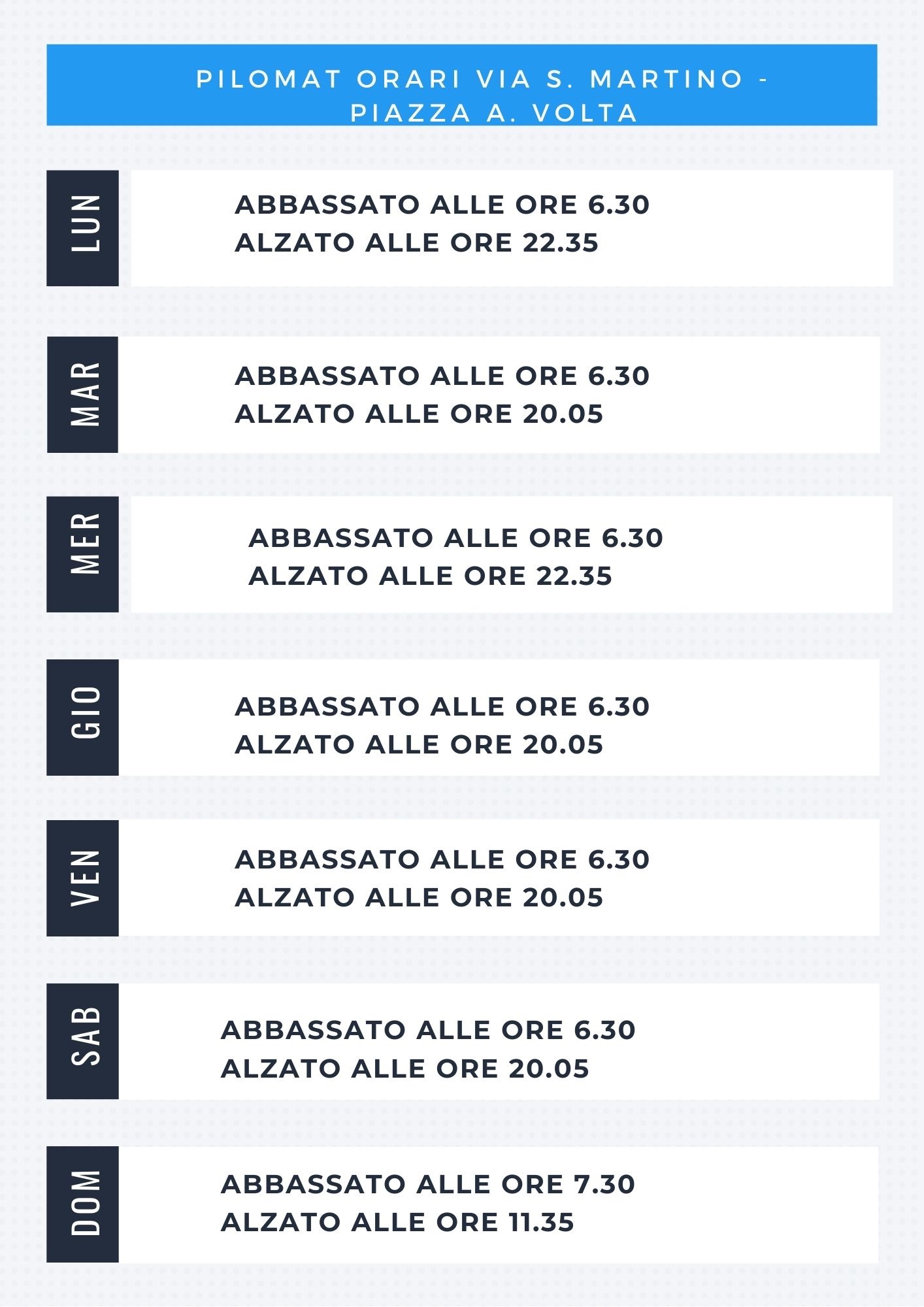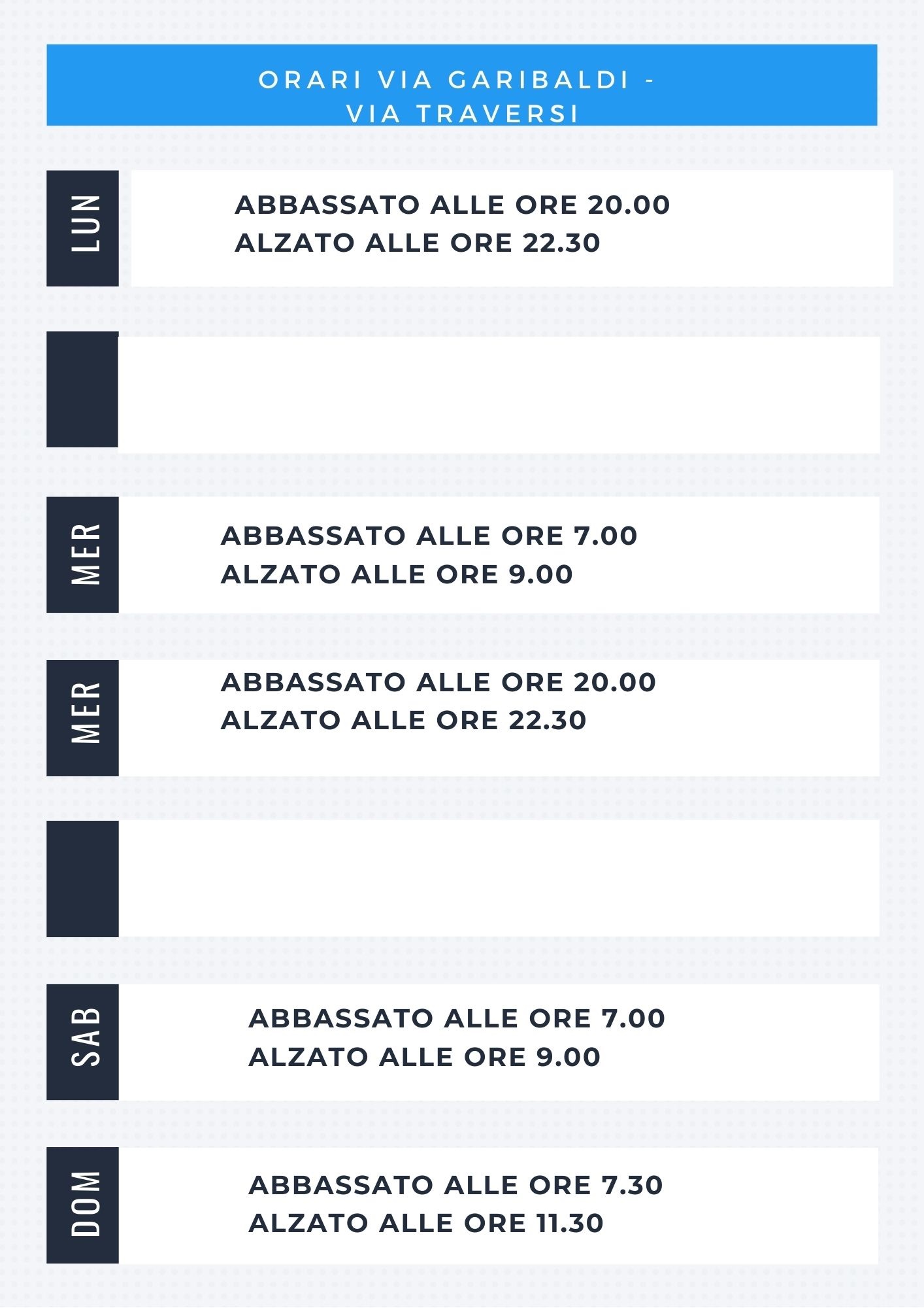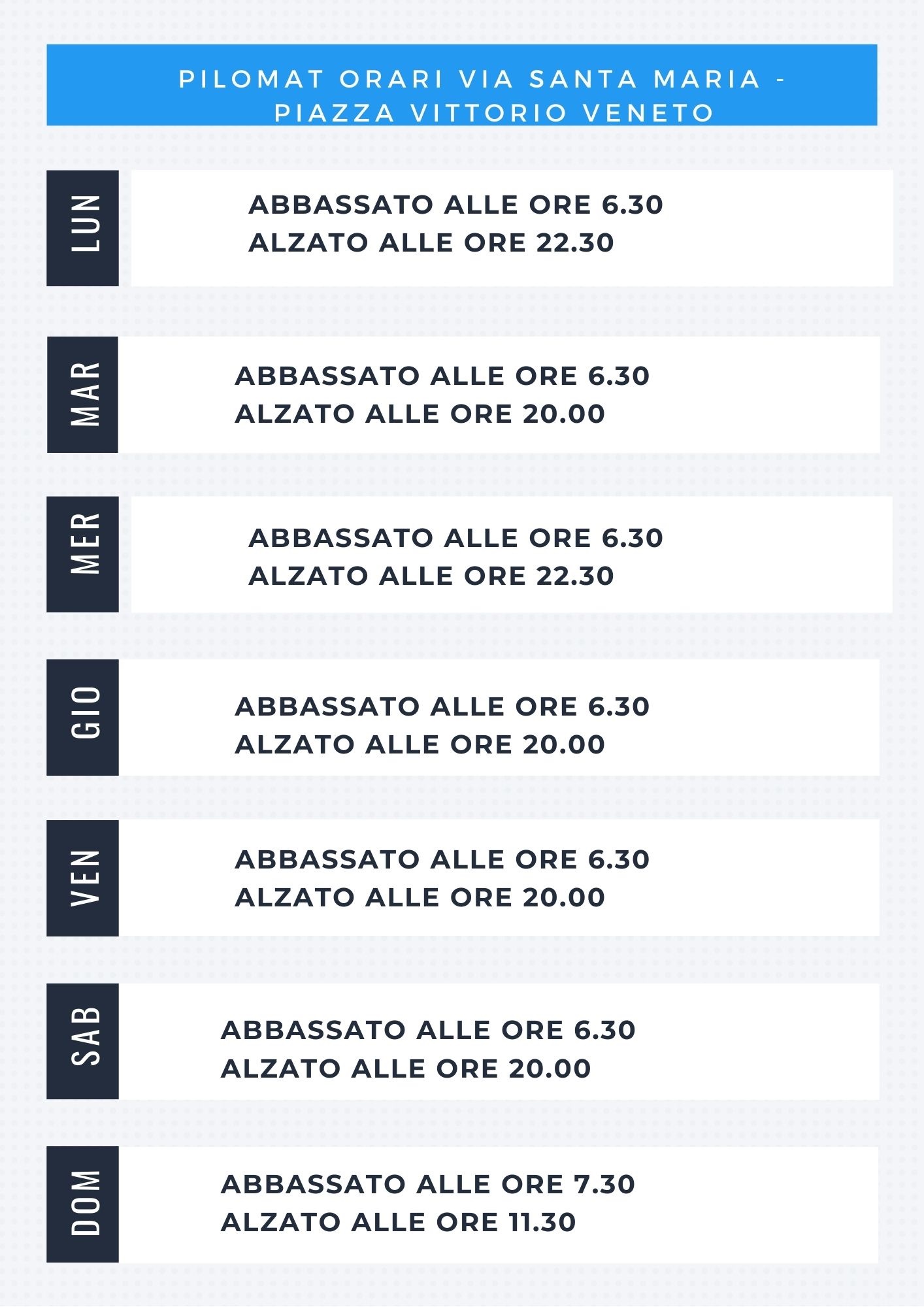 Sono tornati attivi i dissuasori mobili in alcuni punti della viabilità cittadina: Via Santa Maria – Piazza Vittorio Veneto, Via Garibaldi – Via Traversi, Via S.Martino – Piazza A. Volta. In allegato le tabelle con gli orari.