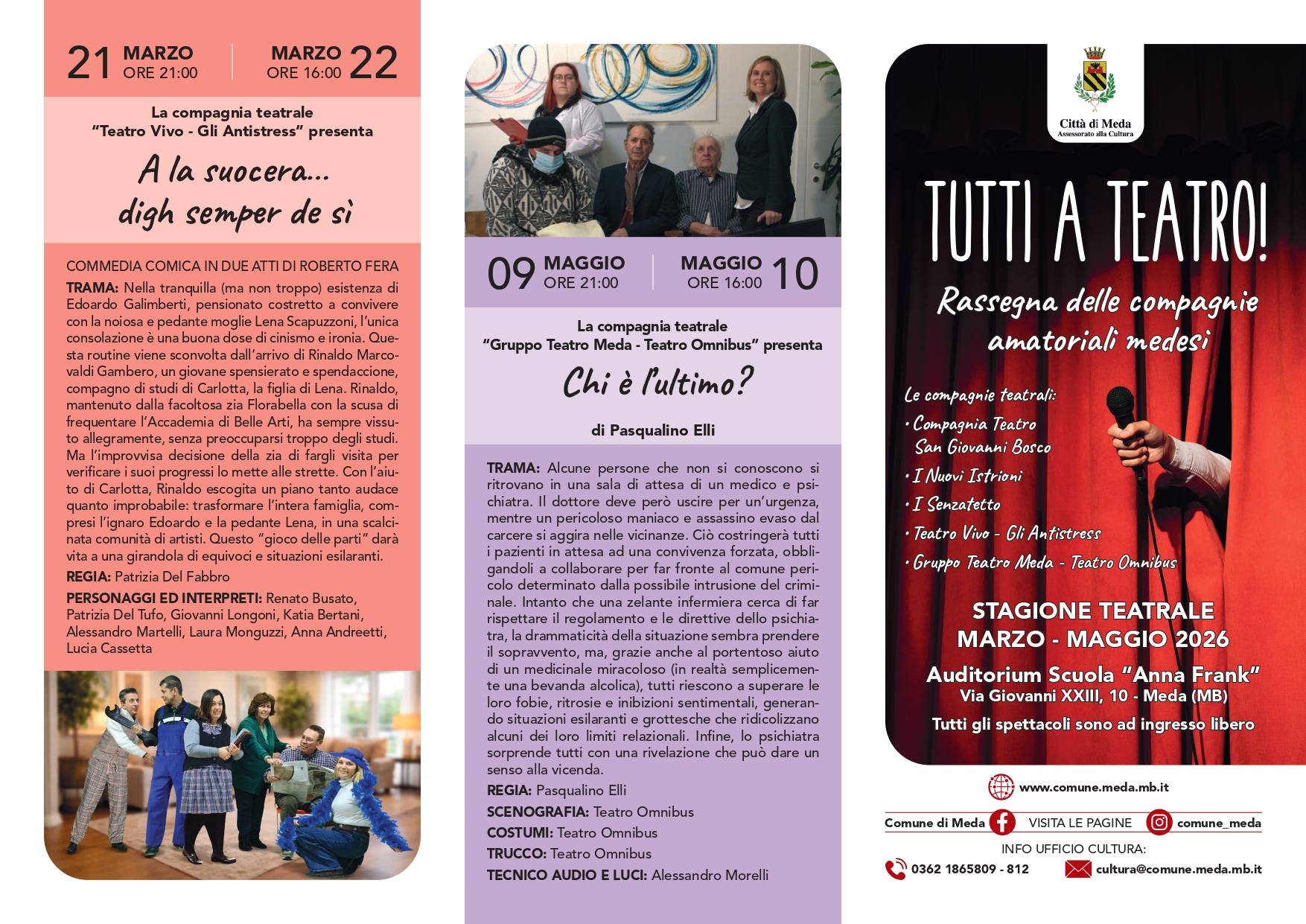 Dal 1° marzo al 10 maggio 2026, l'Auditorium della Scuola "Anna Frank" torna a essere il cuore pulsante della cultura cittadina con la rassegna "Tutti a Teatro!". Un cartellone ricco e variegato che vede protagoniste le storiche compagnie amatoriali del nostro territorio: Compagnia Teatro San Giovanni Bosco, I Nuovi Istrioni, I Senzatetto, Teatro Vivo - Gli Antistress e il Gruppo Teatro Meda - Teatro Omnibus.