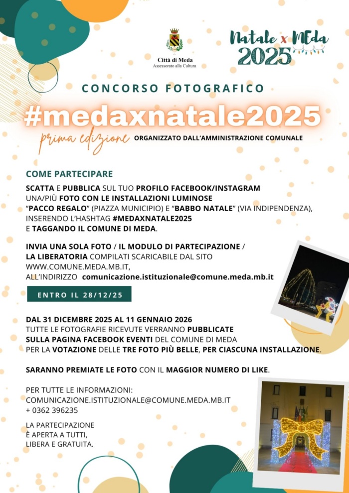 Dal 31 dicembre 2025 al 11 gennaio 2026, tutte le fotografie ricevute verranno pubblicate sulla pagina Facebook Eventi del Comune di Meda per la votazione delle tre foto più belle, per ciascuna installazione.
