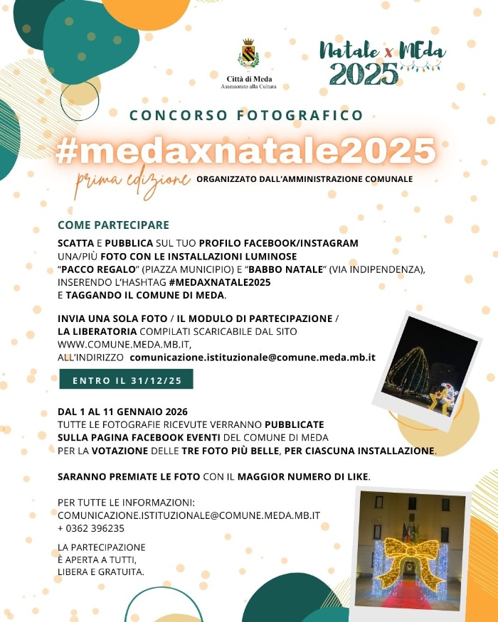 Dal 1 gennaio 2026 al 11 gennaio 2026, tutte le fotografie ricevute verranno pubblicate sulla pagina Facebook Eventi del Comune di Meda per la votazione delle tre foto più belle, per ciascuna installazione.