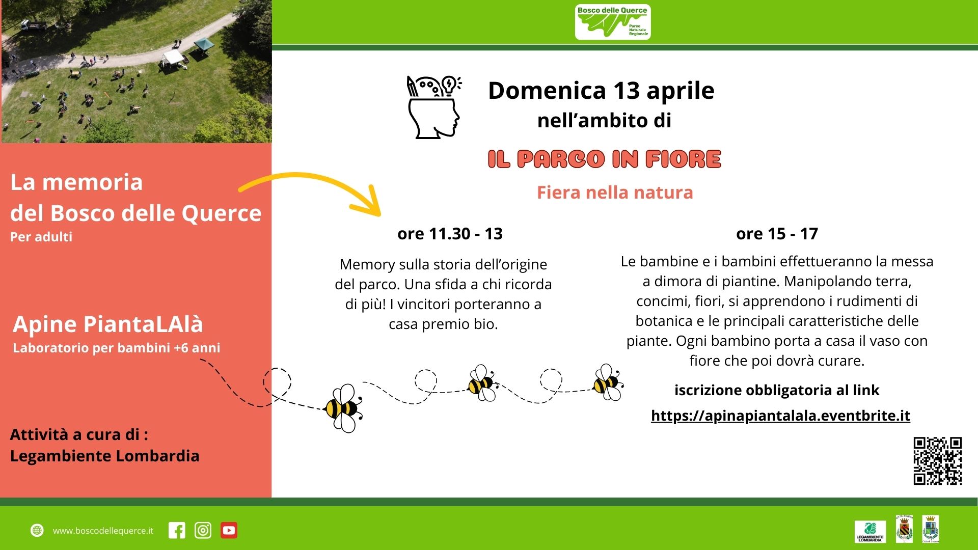Nell’ambito della manifestazione “IL PARCO IN FIORE Fiera nella natura” che si terrà al Bosco delle Querce domenica 13 aprile 2025 a partire dalle ore 10, Legambiente Lombardia propone due laboratori aperti a tutti e gratuiti.