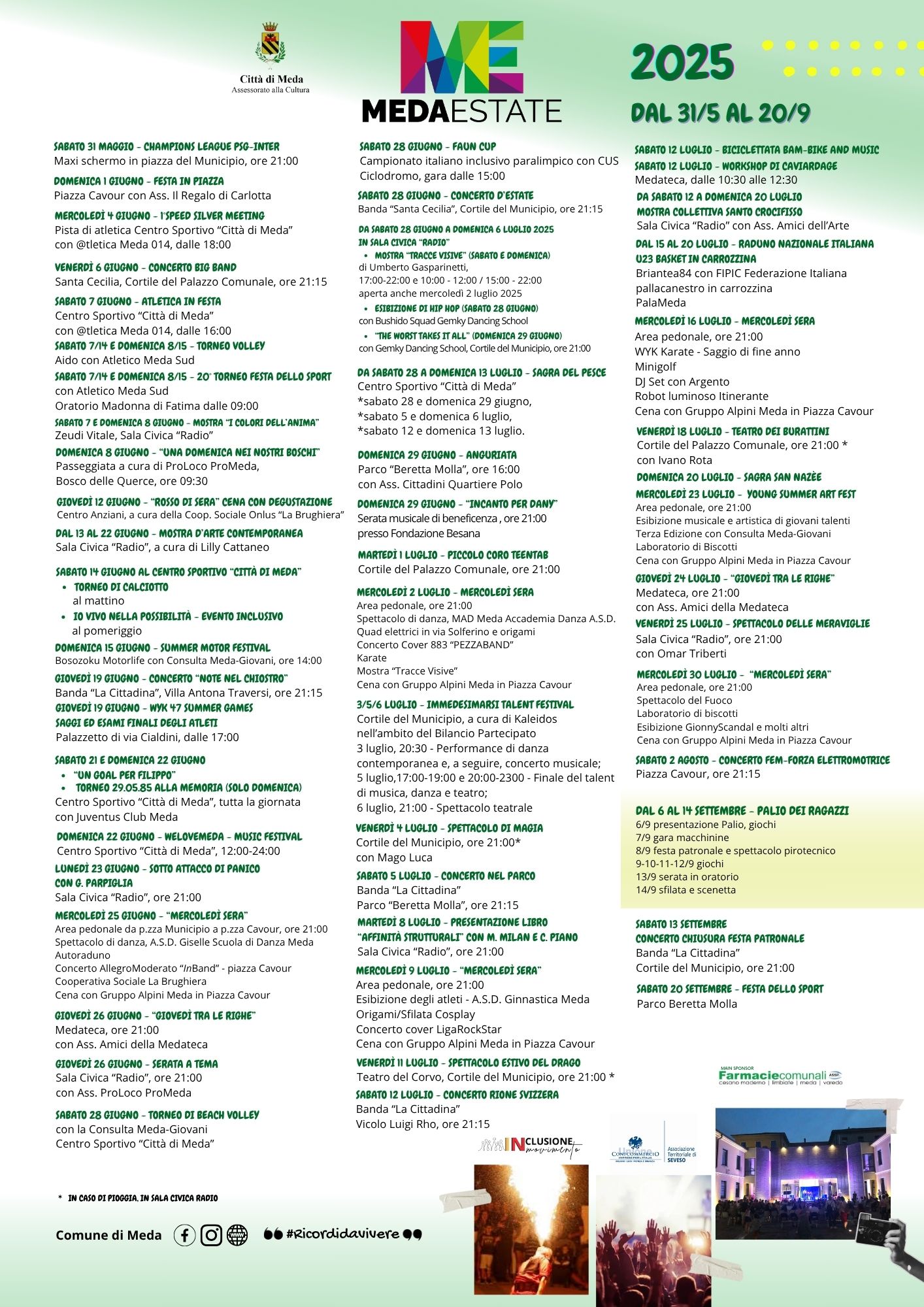 “Meda In Estate” è la rassegna culturale estiva promossa dal Comune di Meda, che anima la città da giugno a settembre con spettacoli, concerti, cinema all’aperto, iniziative per famiglie e appuntamenti dedicati ai giovani. Un programma ricco e variegato pensato per valorizzare gli spazi pubblici e offrire occasioni di incontro, socialità e partecipazione per tutte le età.