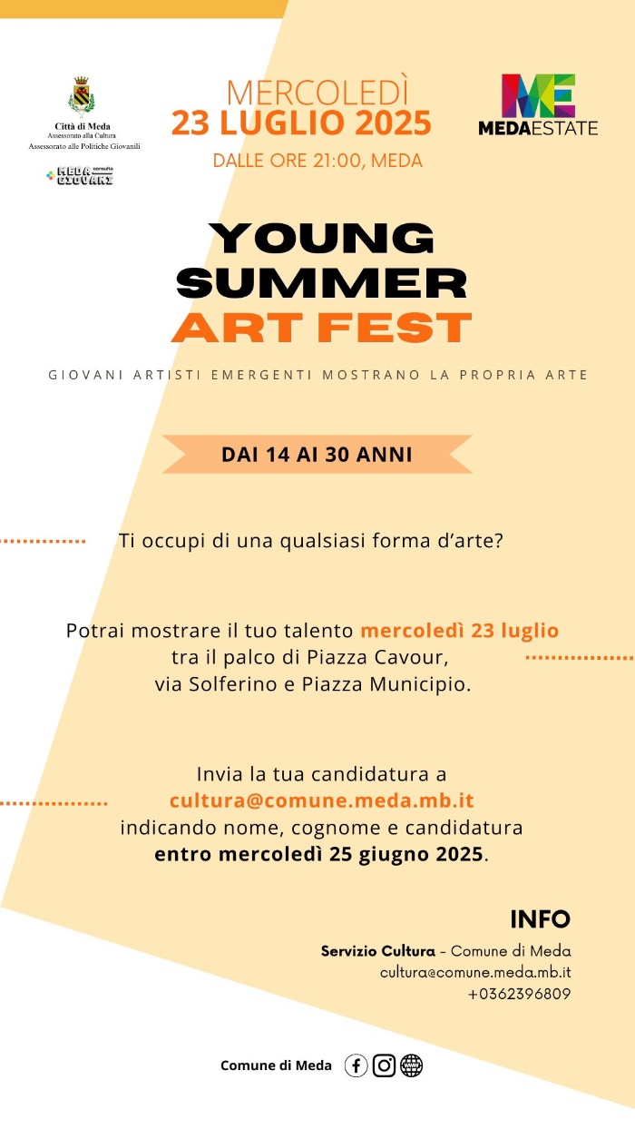 A Meda, in occasione dei mercoledì di MEDAestate, il 23 luglio dalle ore 21.00 ritorna lo Young Summer Art Fest