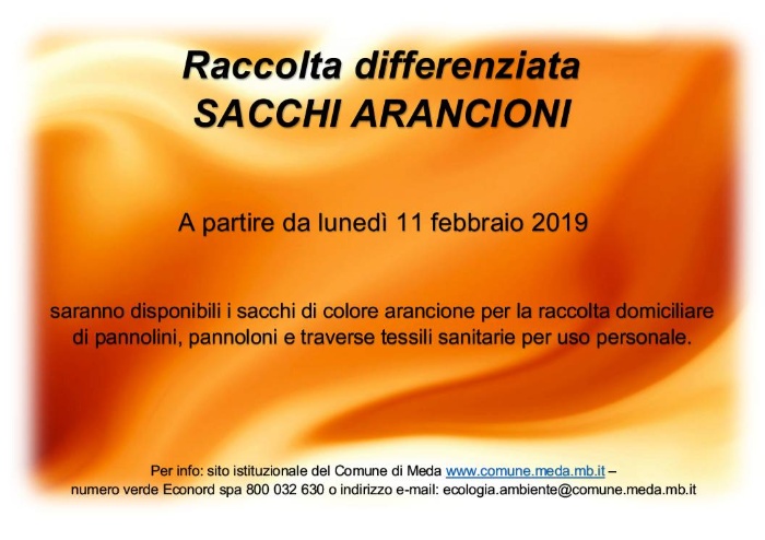 A partire da lunedì 11 febbraio 2019 sono disponibili i sacchi di colore arancione per la raccolta domiciliare di pannolini, pannoloni e traverse tessili sanitarie per uso personale.