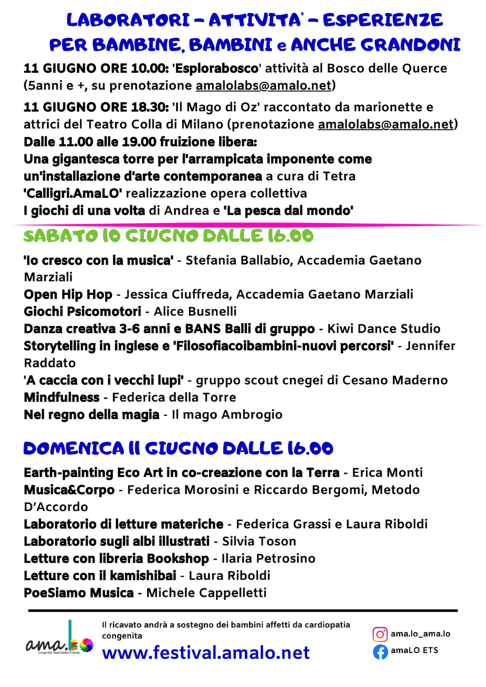 Con deliberazione n. 102 del 22.05.2023 è stato concesso il patrocinio all'associazione Amalo per la realizzazione dello spettacolo "10° Festival ama.Lo " in programma dal 09 all' 11giugno 2023 presso il Centro polifunzionale di Seveso.