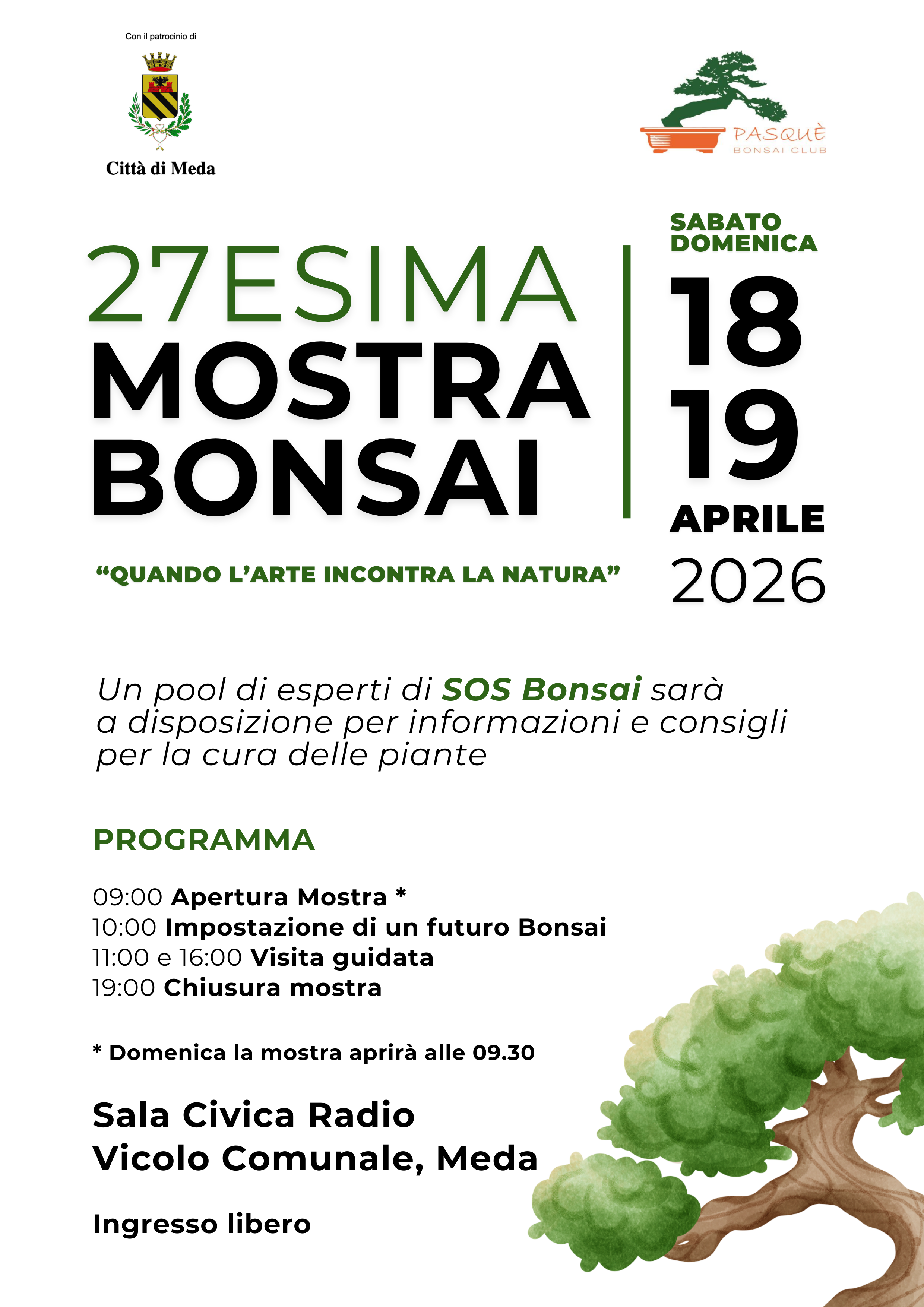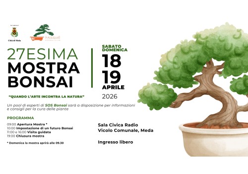 Sabato 18 e domenica 19 aprile 2026, la Sala Civica Radio ospita la 27ª Mostra Bonsai, un appuntamento imperdibile patrocinato dalla Città di Meda in collaborazione con il Pasquè Bonsai Club. Sotto il suggestivo tema "Quando l'arte incontra la natura", i visitatori potranno ammirare esemplari straordinari e approfondire la conoscenza di questa antica disciplina.