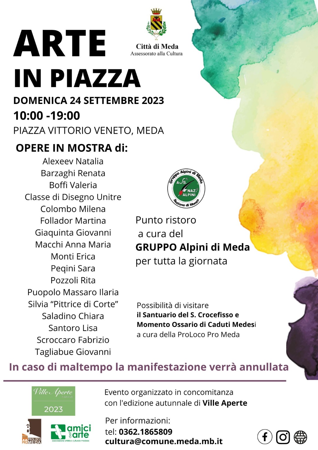 L'Assessorato alla Cultura del Comune di Meda, grazie alla collaborazione dell'Associazione Amici dell'Arte, invita la Cittadinanza a partecipare a un'importante iniziativa culturale che ha deciso di riproporre, nel suggestivo scenario di Piazza Vittorio Veneto, dopo il successo dello scorso anno: una mostra d'arte open air con artisti singoli e appartenti ad alcune Associazioni medesi