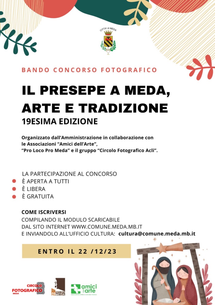 L'Amministrazione Comunale, in collaborazione con le Associazioni “Amici dell’Arte”, “Pro Loco Pro Meda” propone la diciannovesima edizione del concorso fotografico “Il Presepe a Meda, arte e tradizione”.