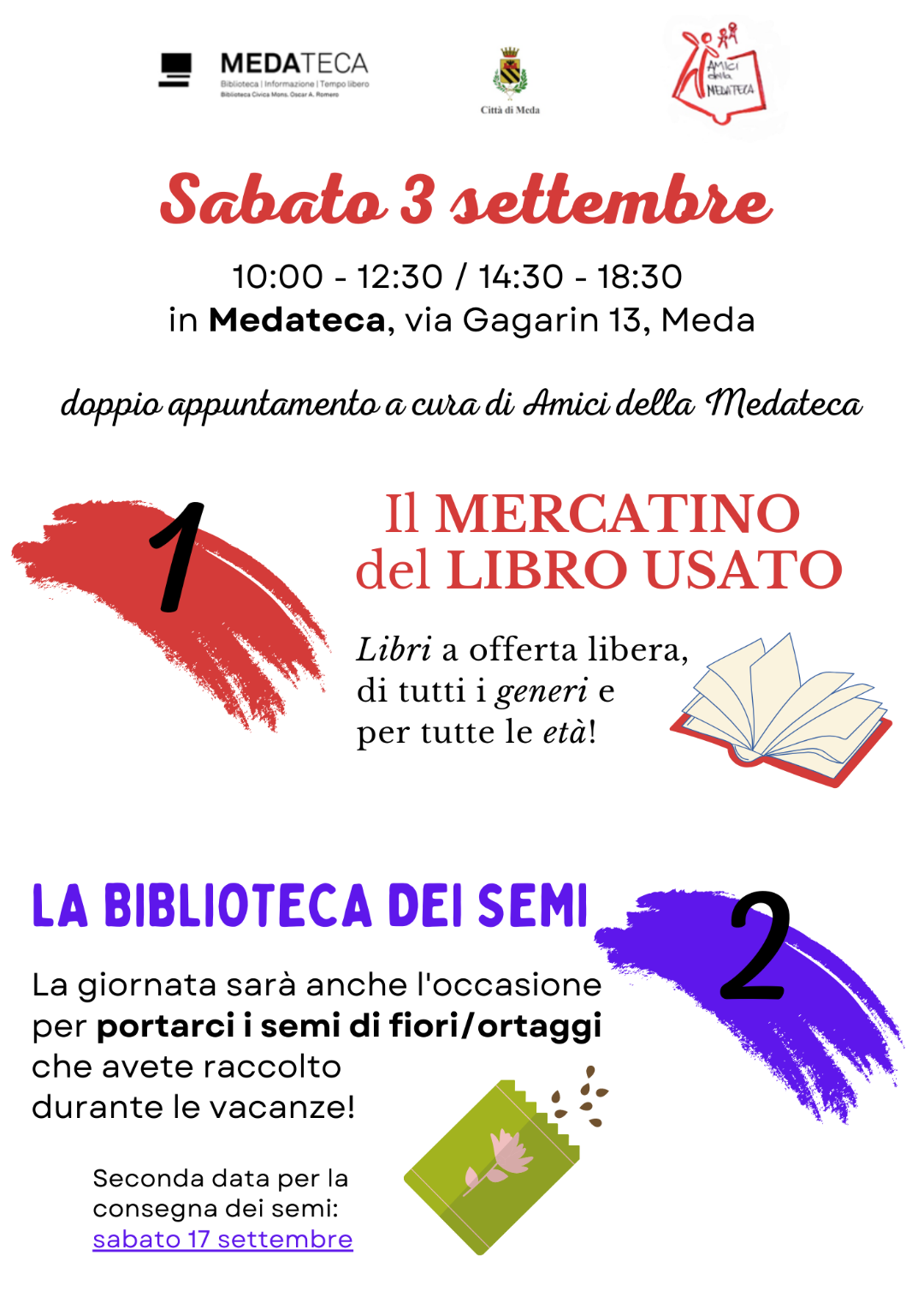 Eventi a cura dell'Associazione Amici della Medateca Doppio appuntamento sabato 3 settembre con gli Amici della Medateca mercatino del libro usato e scambio di semi presso il piano terra della Medateca