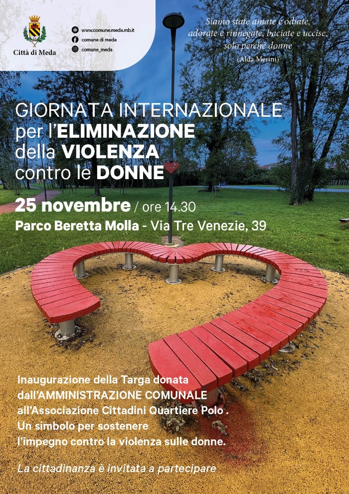 Sabato 25 Novembre 2023, ore 14:30 appuntamento di grande risonanza nel Parco Beretta Molla, in occasione della Giornata internazionale per l'eliminazione della violenza contro le donne, sarà inaugurata la targa donata dall'Amministrazione Comunale all'Associazione Cittadini Quartiere Polo. L'opera realizzata dall'Associazione denominata Esci dal Silenzio, è un simbolo dell'impegno per la sensibilizzazione e sostegno verso tutte le donne contro la violenza.