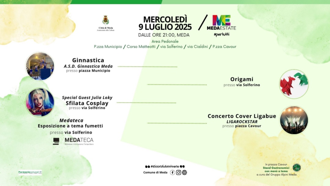 Dalle ore 21:00 il centro cittadino si anima con un’esplosione di eventi: esibizioni ginniche in piazza Municipio, laboratori e installazioni di origami in via Solferino, mostra fumetti a cura della Medateca, e l’imperdibile sfilata cosplay con la special guest Julia Loky. In piazza Cavour, musica dal vivo con la cover band Ligarockstar, tributo a Ligabue, e stand gastronomici a cura del Gruppo Alpini Meda.