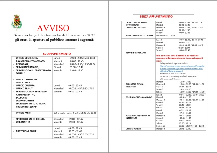 Descrizione Con Ordinanza Sindacale n. 36 del 01.10.2025 il SIndaco ha disposto la modifica degli orari degli uffici comunali con decorrenza 01.11.2025 come sotto specificato: Ordinanza Sindacale n. 36 del 01.10.2025 (pdf - 561 KB)