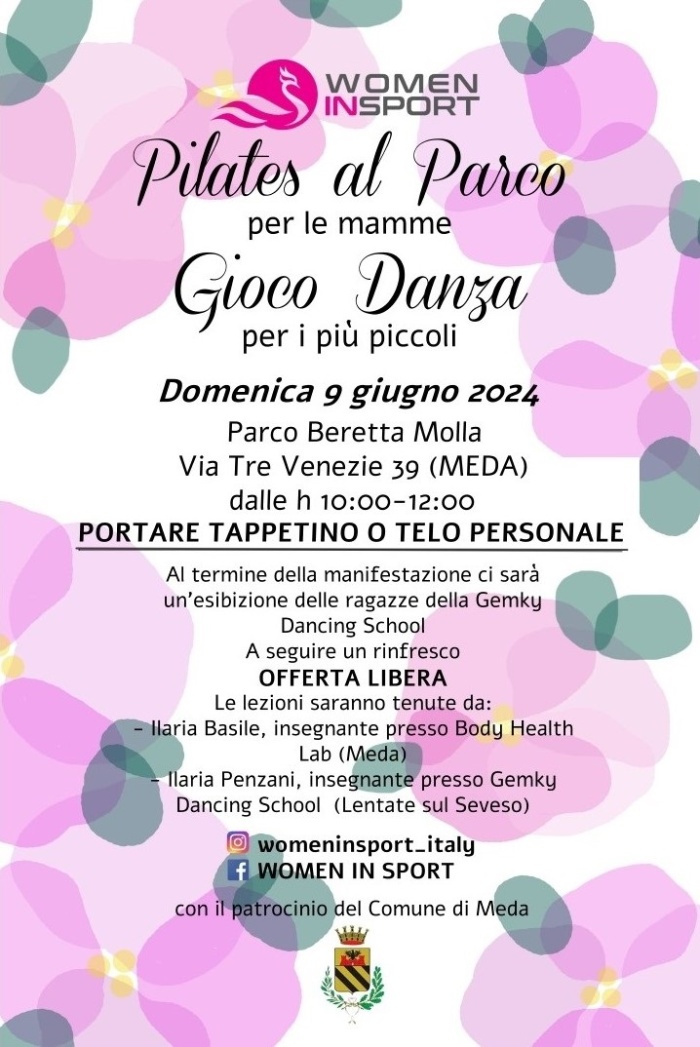 propone una lezione di Pilates al Parco per le mamme e Gioco Danza per i più piccoli.