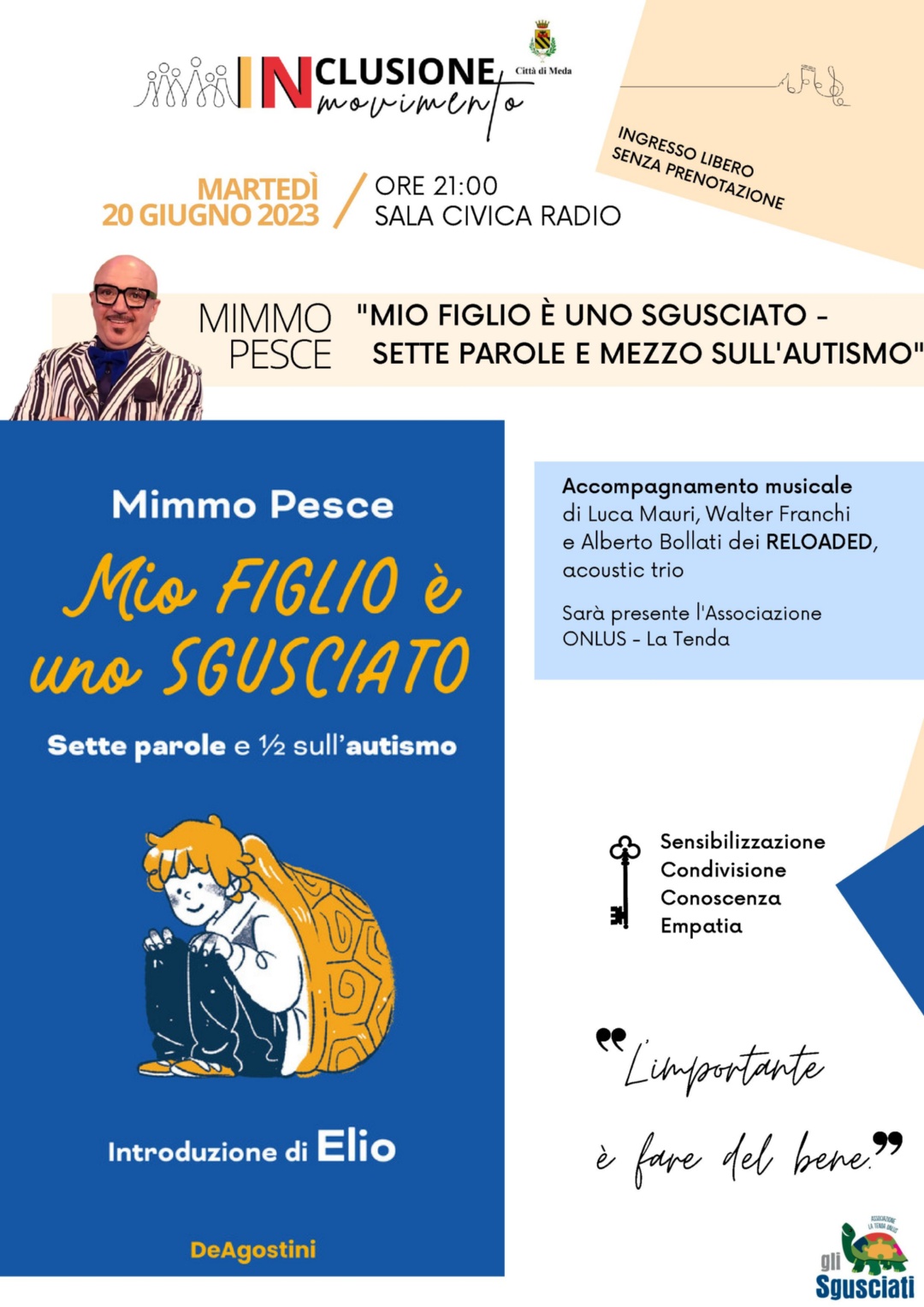 presentazione del libro di Mimmo Pesce “Mio figlio è uno sgusciato – Sette parole e mezzo sull’autismo”, accompagnata dal trio acustico Reloaded. All’evento prenderà parte l’Associazione ONLUS – La Tenda. L’autore ci trasporterà in un viaggio per scoprire il mondo di un bimbo autistico; suo figlio. Un immaginario, il suo, ovattato che tenta di difendersi dagli stimoli, per lui troppo forti, del mondo esterno. Con tanta delicatezza e cura viene affrontato il tema dell’autismo nella relazione con la genitorialità.