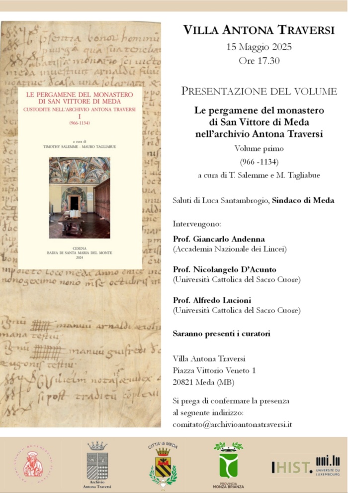 Nella suggestiva location di Villa Antona Traversi, in data 15 Maggio alle ore 17:30 ci sarà la presentazione del volume "Le pergamene del monastero di San Vittore Meda nell'archivio Antona Traversi" volume primo (966 - 1134) a cura di T. Salemme e M. Tagliabue.