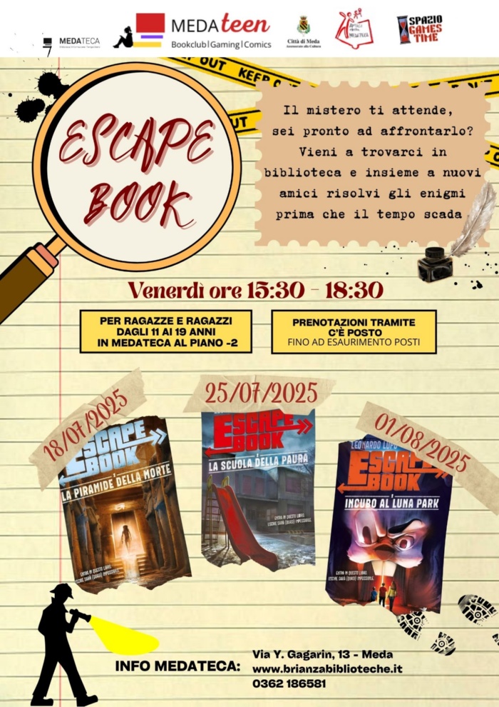 Il primo appuntamento, per ragazze e ragazzi da 11 a 19 anni, si svolgerà venerdì 18 luglio 2025 dalle ore 16:30 alle ore 18:30, al piano -2 della Medateca, presso lo Spazio Games Time, appunto, con un libro gioco, del tipo escape book.