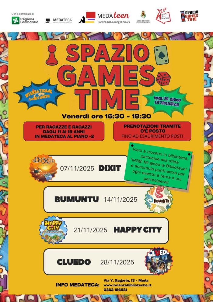 Durante il mese di novembre 2025, in occasione del mese internazionale del gioco, lo Spazio Games Time vi aspetta con una serie di incontri per la sfida "MGB: Mi Gioco la Biblioteca".