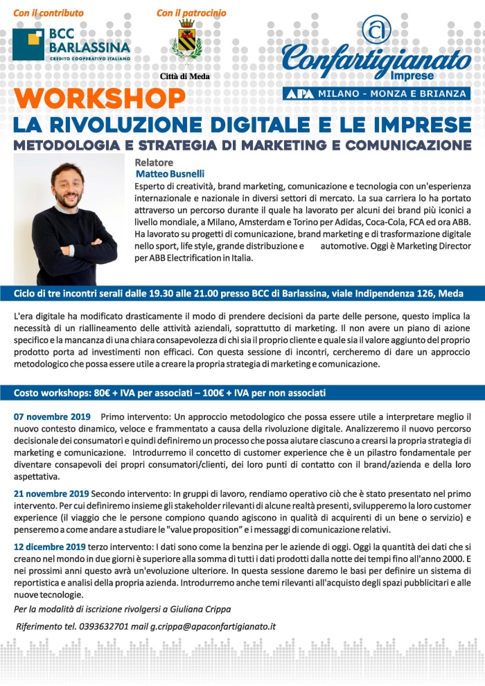 La Confartigianato Imprese, con il Patrocinio del Comune di Meda, organizza un ciclo di tre incontri per dare un approccio metodologico che possa essere utile a creare la propria strategia di marketing e comunicazione.