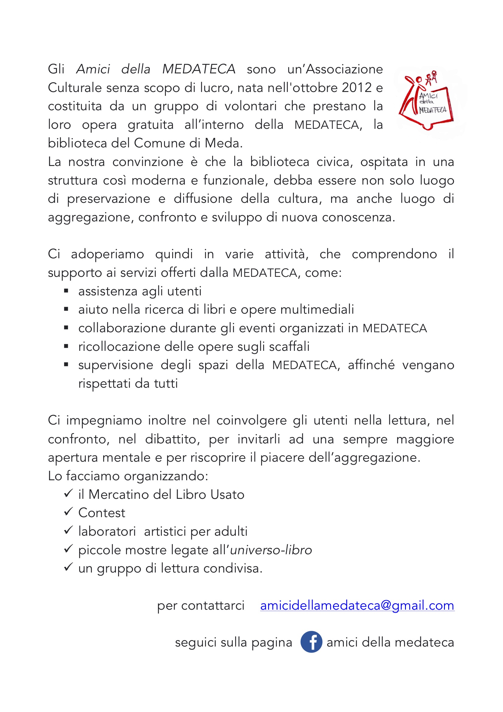 - sostenere l’offerta culturale della Medateca, la programmazione di promozione del servizio e la valorizzazione delle collezioni; organizzare e realizzare, con apposite convenzioni: corsi, seminari ed incontri coerenti con le finalità dell’associazione;