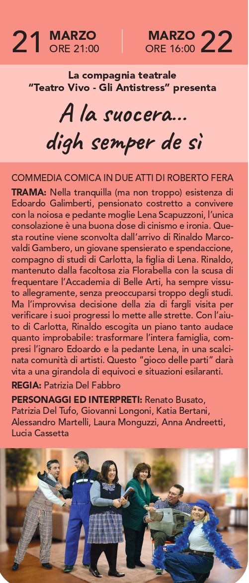 La compagnia teatrale "Teatro Vivo - Gli Antistress" presenta una commedia comica in due atti di Roberto Fera per la regia di Patrizia Del Fabbro. La tranquilla routine di Edoardo Galimberti e della pedante moglie Lena viene stravolta dall'arrivo di Rinaldo, un giovane scapestrato che, per non perdere il sostegno della zia Florabella, coinvolge l'intera famiglia in un piano audace quanto assurdo. Tra finzioni e situazioni esilaranti, il "gioco delle parti" è assicurato.