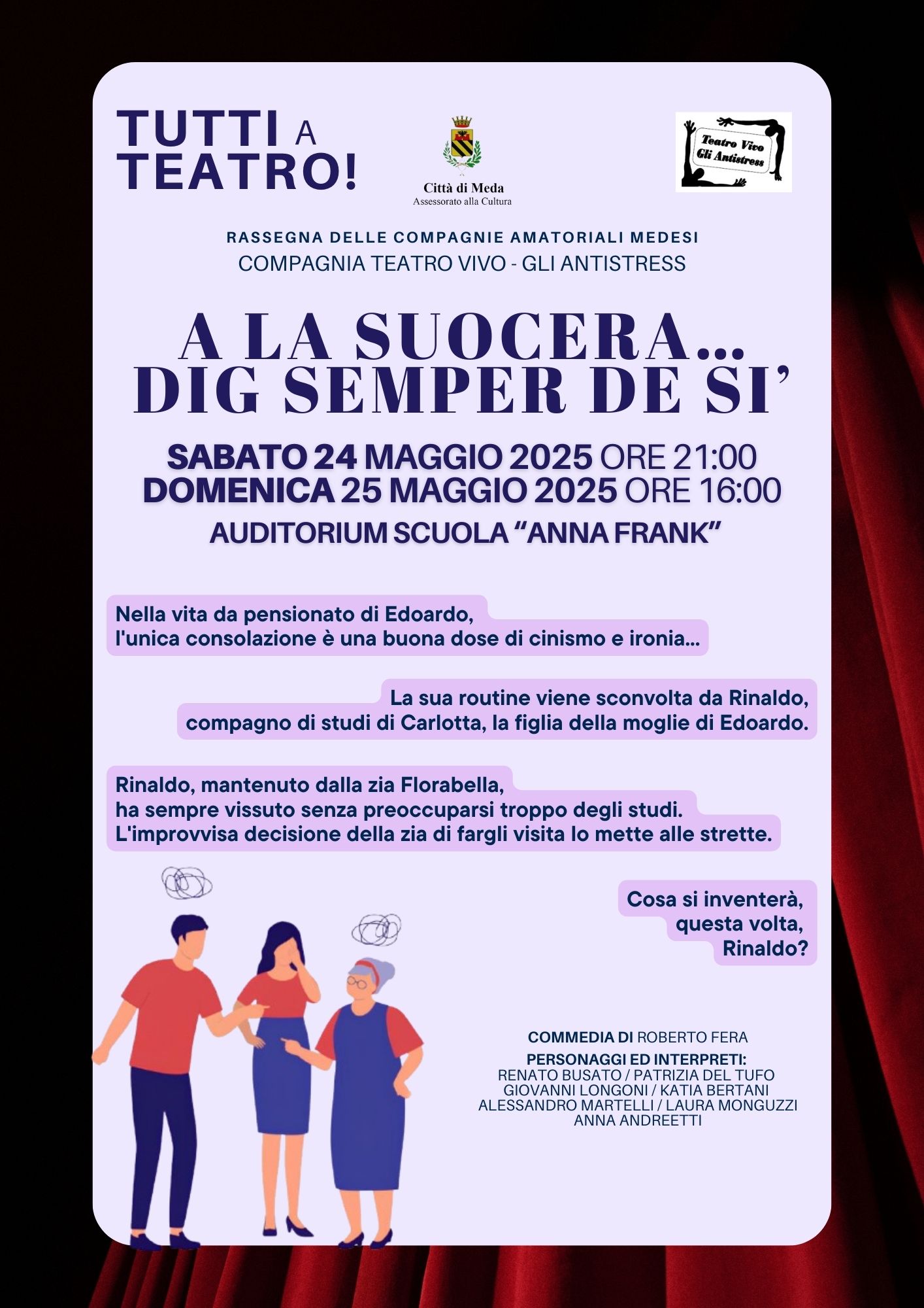 La compagnia teatrale "Teatro Vivo Gli Antistress", all'interno della rassegna delle compagnie amatoriali medesi. presenta lo spettacolo: "A la suocera... dig semper de sì", commedia comica in due atti di Roberto Fera.