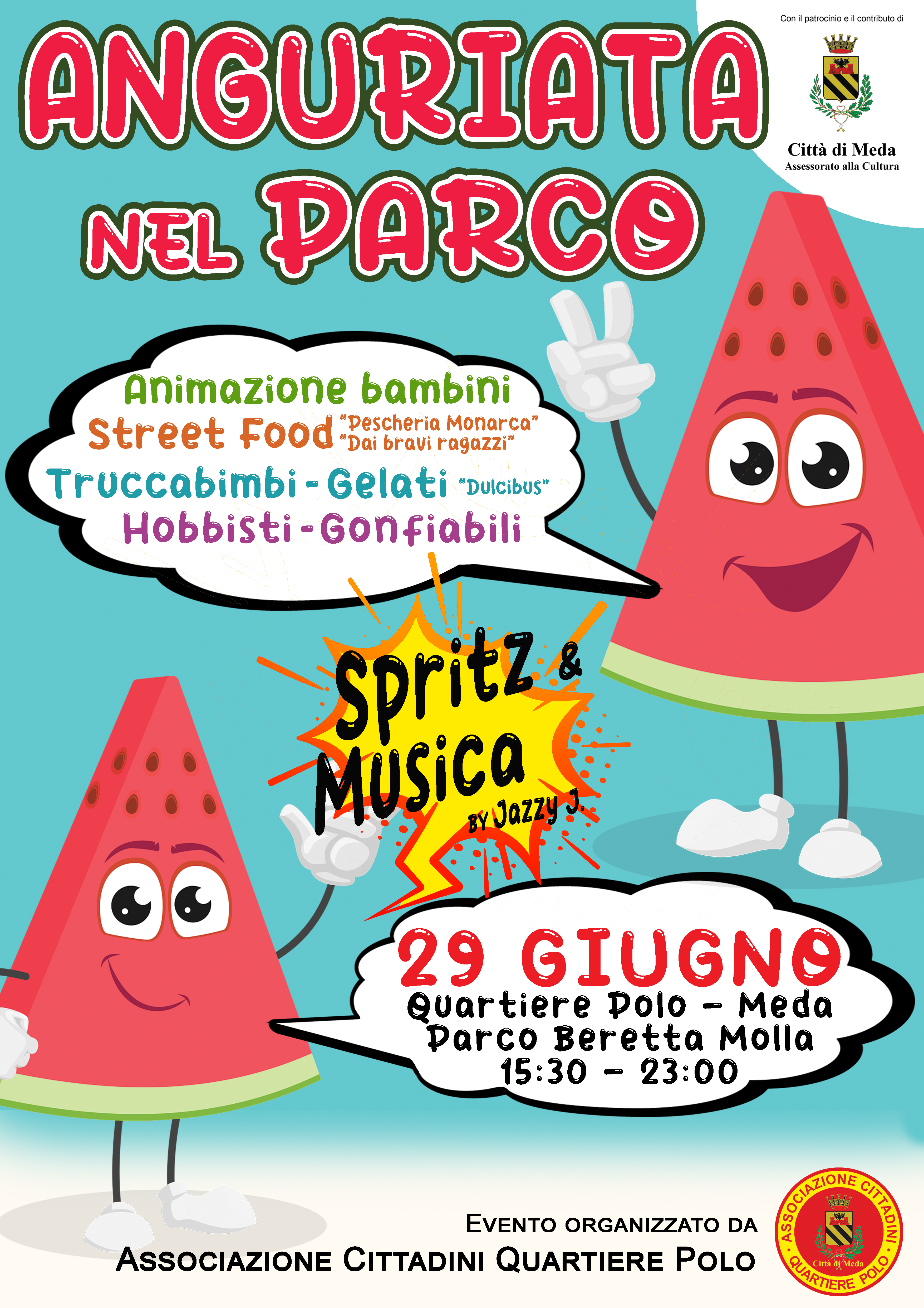 L’Anguriata nel Parco torna anche quest’anno con una giornata di festa al Parco Beretta Molla, nel quartiere Polo di Meda! Domenica 29 giugno, dalle 15:30 alle 23:00, vi aspettano animazione per bambini, gonfiabili, hobbisti, street food, gelati, truccabimbi e tanta musica dal vivo con Spritz & Music by Jazzy. Un’occasione perfetta per trascorrere del tempo all’aperto tra divertimento e gusto!