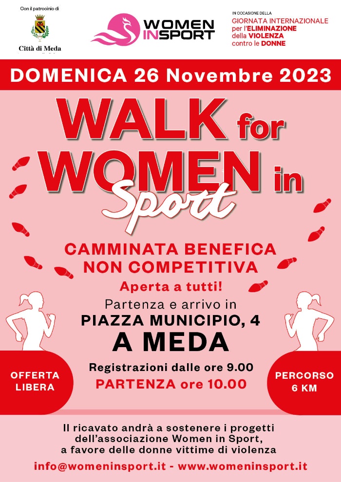 L'Amministrazione Comunale è lieta di invitare la Cittadinanza a partecipare alla Walk for Woman in Sport, camminata benefica organizzata in occasione della Giornata Internazionale per l'Eliminazione della Violenza contro le Donne.
