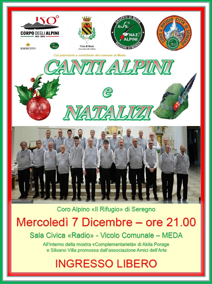 Evento a cura dell'"Associazione Nazionale Alpini - Gruppo di Meda" Canti alpini e natalizi Concerto del coro alpino “Il Rifugio” di Seregno