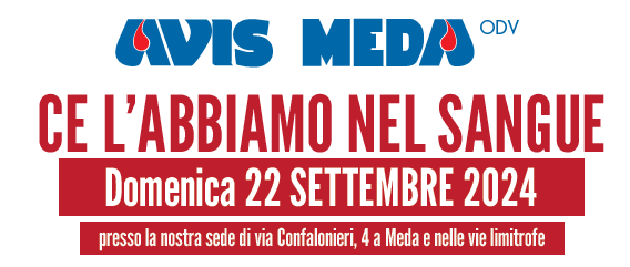 Avis Meda con il patrocinio del Comune di Meda ha organizzato per il giorno 22 settembre 2024, presso la sede in via Confalonieri 4 e vie limitrofe, la festa “Ce l’abbiamo nel sangue”!