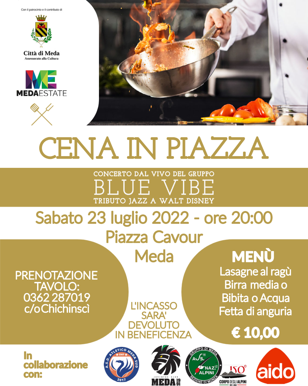 Sabato 23 luglio 2022 ore Piazza Meda - 20:00 Cavour CENA IN PIAZZA CONCERTO DAL VIVO DEL GRUPPO BLUE VIBE TRIBUTO JAZZ A WALT DISNEY L'INCASSO SARA' DEVOLUTO IN BENEFICENZA PRENOTAZIONE TAVOLO: 0362 287019 c/o Chichinscì