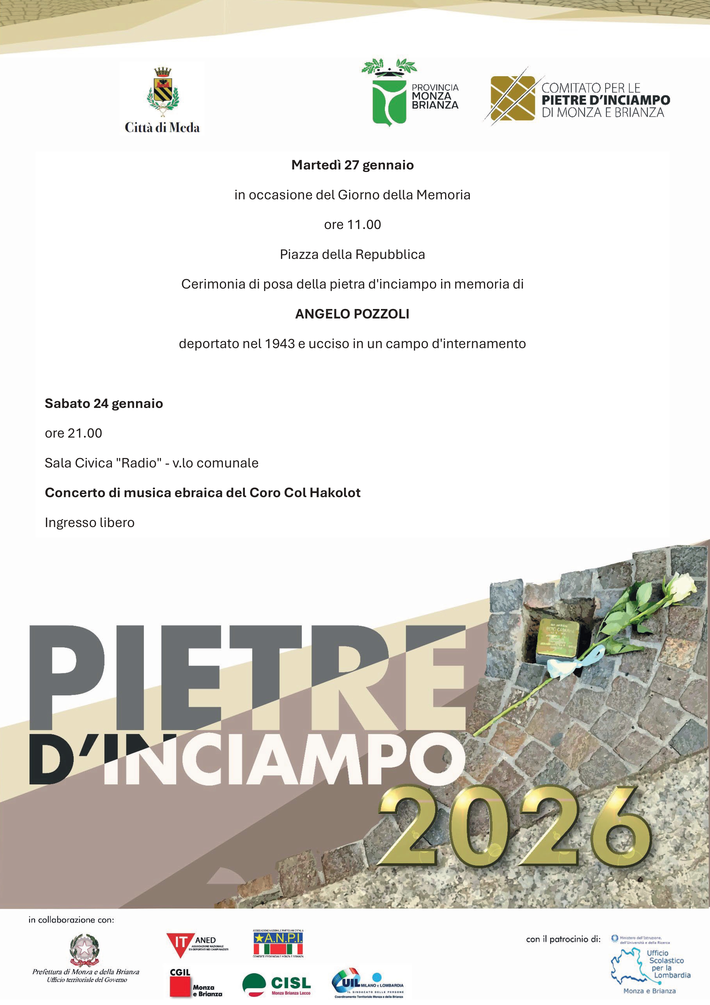Martedì 27 gennaio (ore 11.00): Cerimonia solenne in Piazza della Repubblica per la posa della pietra d'inciampo dedicata ad Angelo Pozzoli, deportato nel 1943 e ucciso in un campo d'internamento.