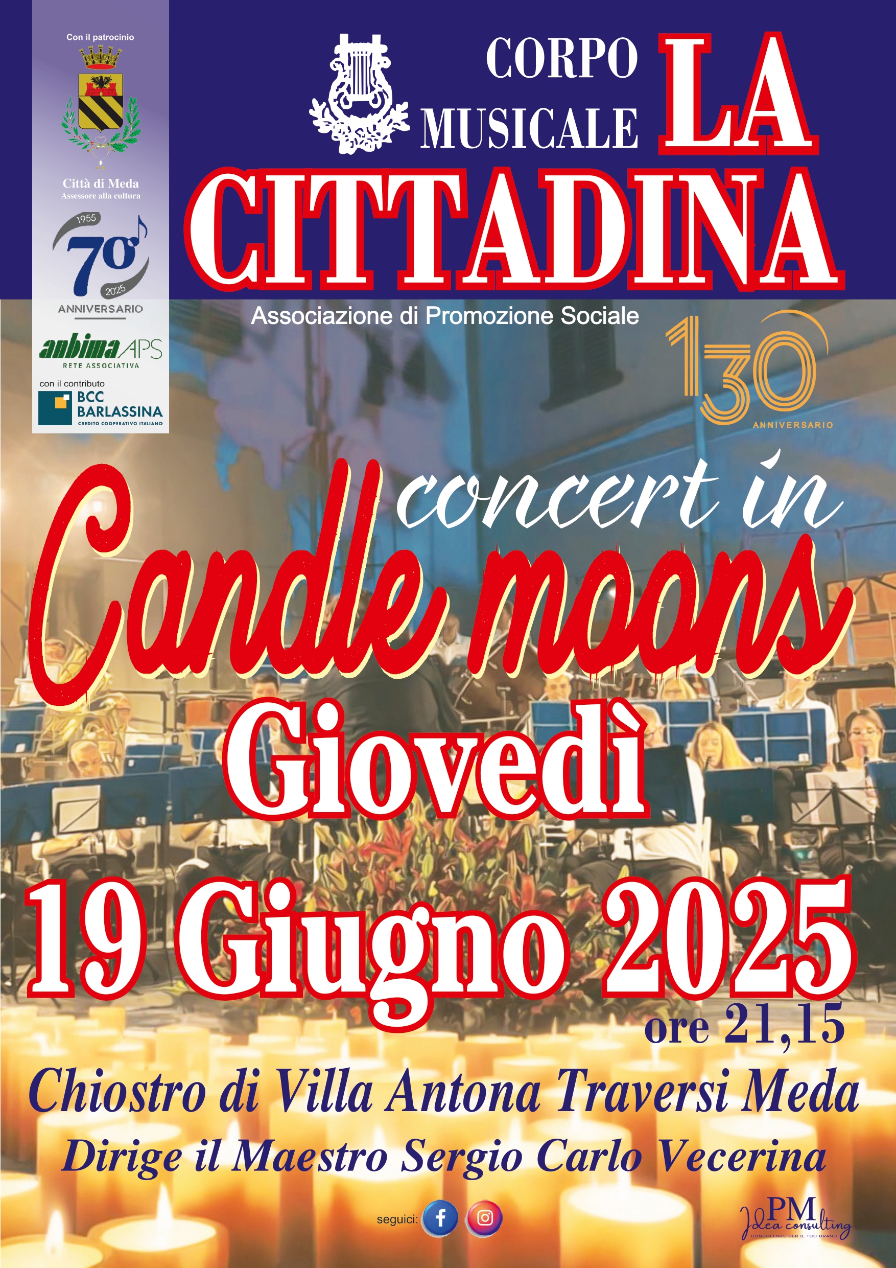 Il Corpo Musicale "La Cittadina" celebra il 130° anniversario con un suggestivo concerto dal titolo "Candle Moons", che si terrà giovedì 19 giugno 2025 alle ore 21.15 presso il chiostro di Villa Antona Traversi a Meda. Una serata di musica sotto le stelle, impreziosita dalla luce calda delle candele, diretta dal Maestro Sergio Carlo Vecerina. L’evento è patrocinato dal Comune di Meda e realizzato con il contributo di ANBIMA APS e BCC Barlassina.