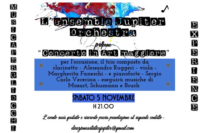 All'interno della mostra Musica per gli Occhi Experience, organizzata dall'Associazione Amici dell'Arte, sabato 5 novembre alle ore 21:00 si terrà un concerto del trio composto da clarinetto - Alessandro Ruggeri - viola - Margherita Faneschi - e pianoforte - Sergio Carlo Vecerina - che eseguirà musiche di Mozart, Schumann e Bruch