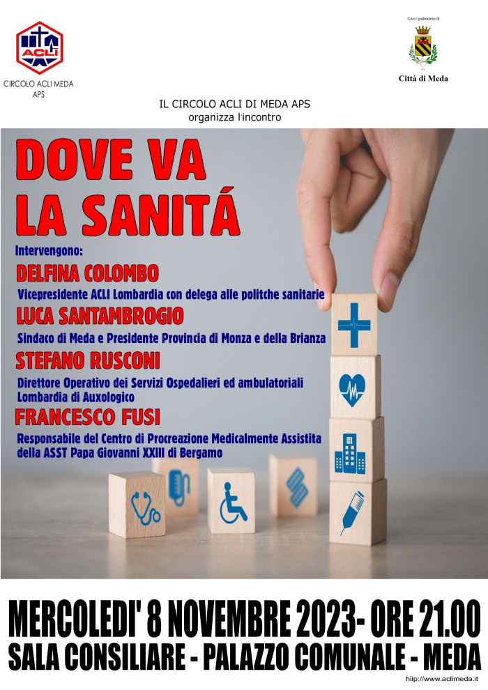 Evento a cura del "Circolo ACLI di MedaAPS" L'Amministrazione Comunale e il Circolo ACLI di MedaAPS sono lieti di invitare la Cittadinanza mercoledì 8 novembre ore 21:00 presso la Sala Pertini all'incontro "Dove va la sanità"