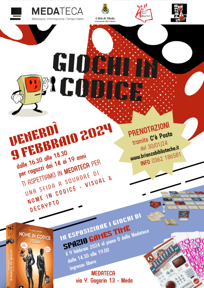 - dalle ore 16:30 alle ore 18:30 presso lo SPAZIO GT, GIOCHI IN CODICE, seduta di gioco organizzato per ragazzi da 14 a 19 anni: prenotazione obbligatoria, a partire dal 30/01/2024, tramite la app C'èposto accessibile dal sito Brianzabiblioteche https://www.brianzabiblioteche.it/
