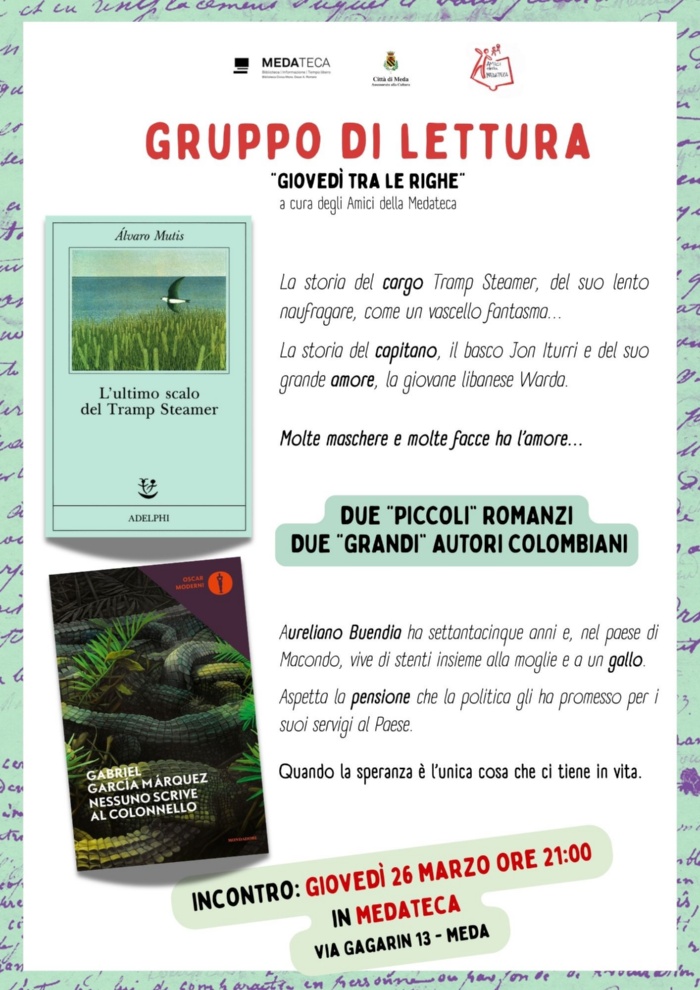 Lungo il percorso tra gli scrittori latino-americani, questo mese il Gruppo di lettura propone due "grandi" della letteratura colombiana: Gabriel Garcia Márquez con il romanzo breve Nessuno scrive al colonnello, e Álvaro Mutis con L'ultimo scalo del Tramp Steamer.