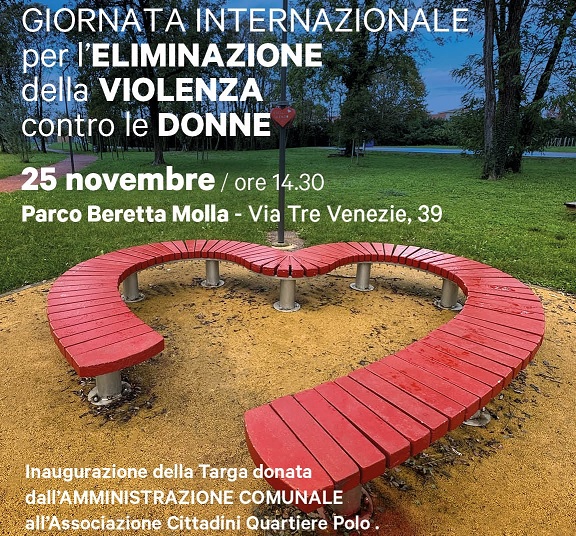 Sabato 25 Novembre 2023, ore 14:30 appuntamento di grande risonanza nel Parco Beretta Molla, in occasione della Giornata internazionale per l'eliminazione della violenza contro le donne, sarà inaugurata la targa donata dall'Amministrazione Comunale all'Associazione Cittadini Quartiere Polo. L'opera realizzata dall'Associazione denominata Esci dal Silenzio, è un simbolo dell'impegno per la sensibilizzazione e sostegno verso tutte le donne contro la violenza.