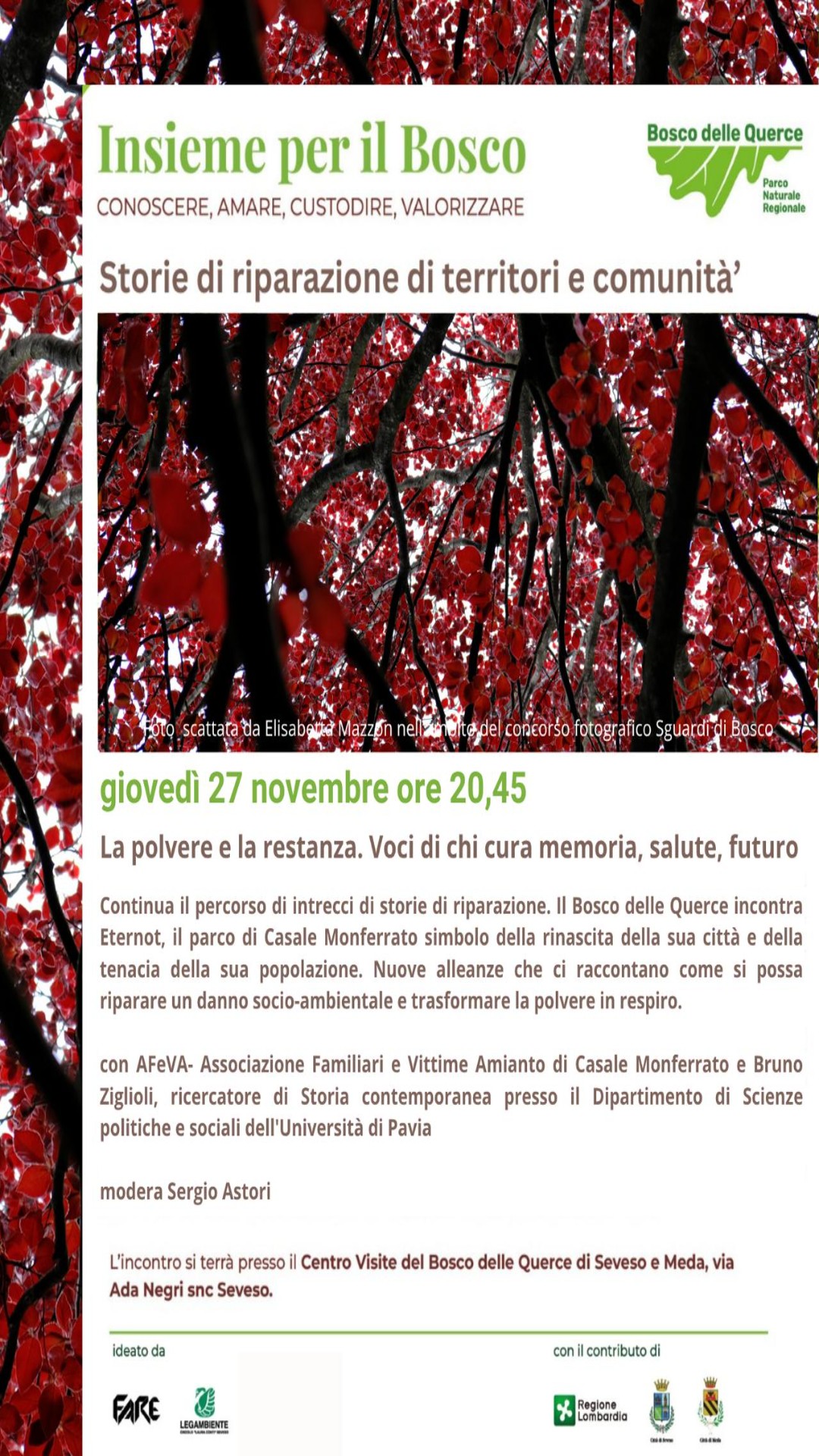 Continua il percorso di intrecci di storie di riparazione. Il Bosco delle Querce incontra Eternot, il parco di Casale Monferrato simbolo della rinascita della sua città e della tenacia della sua popolazione. Nuove alleanze che ci raccontano come si possa riparare un danno socio-ambientale e trasformare la polvere in respiro.
