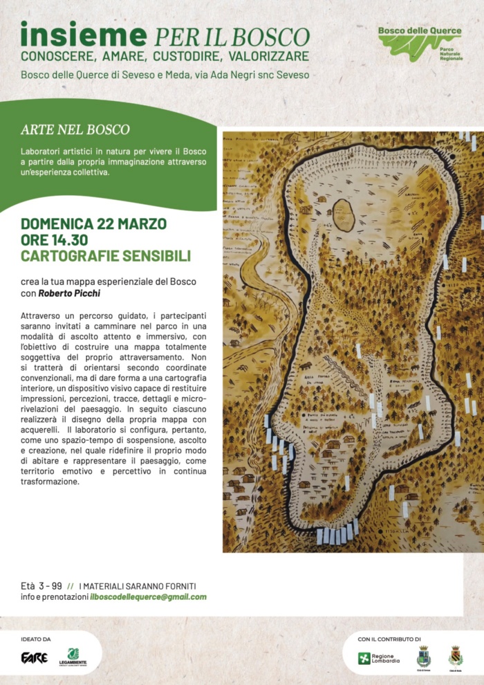 Attraverso un percorso guidato, i partecipanti saranno invitati a camminare nel parco in una modalità di ascolto attento e immersivo, con l’obiettivo di costruire una mappa totalmente soggettiva del proprio attraversamento. Non si tratterà di orientarsi secondo coordinate convenzionali, ma di dare forma a una cartografia interiore, un dispositivo visivo capace di restituire impressioni, percezioni, tracce, dettagli e micro-rivelazioni del paesaggio. In seguito ciascuno realizzerà il disegno della propria mappa con acquerelli. Il laboratorio si configura, pertanto, come uno spazio-tempo di sospensione, ascolto e creazione, nel quale ridefinire il proprio modo di abitare e rappresentare il paesaggio, come territorio emotivo e percettivo in continua trasformazione.