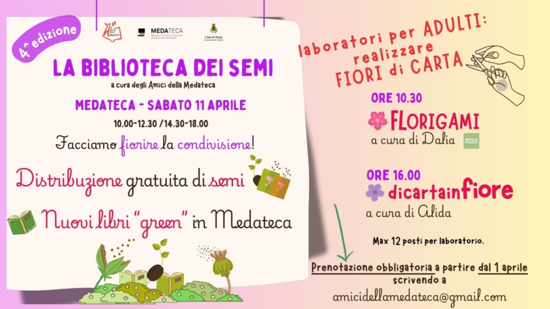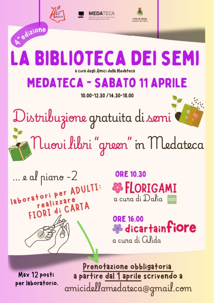 L'associazione culturale "Amici della Medateca", in occasione della giornata di distribuzione gratuita di semi, è lieta di invitare la cittadinanza al laboratorio gratuito, dedicato agli adulti, per realizzare fiori di carta.