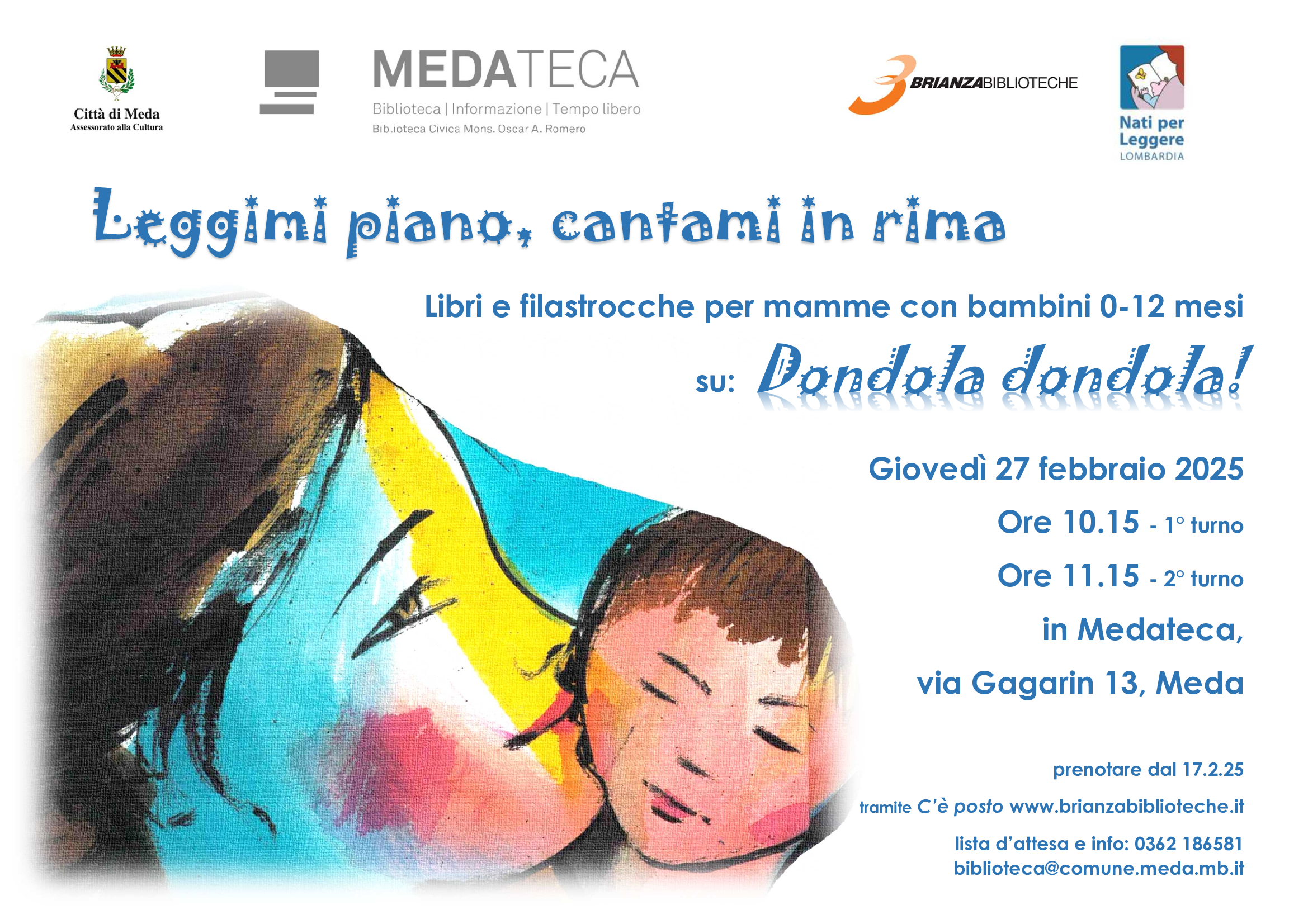 Giovedì 27 febbraio 2025 in Medateca, si terrà un nuovo incontro della serie "Leggimi piano, cantami in rima. Libri e filastrocche per mamme con bambini 0-12 mesi", a cura del personale della Medateca, nell'ambito del progetto "Nati per Leggere".