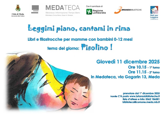 Giovedì 11 dicembre 2025, al piano uno della Medateca, presso la Sala Ragazzi, a cura del personale della Medateca, nell'ambito del progetto "Nati per Leggere" si terrà un nuovo incontro di "Leggimi piano, cantami in rima. Libri e filastrocche per mamme con bambini 0-12 mesi".