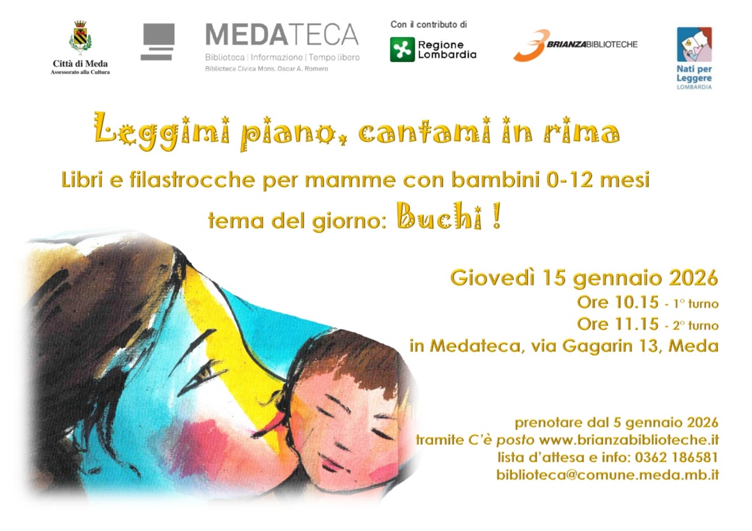 Giovedì 15 gennaio 2026, al piano uno della Medateca, presso la Sala Ragazzi, nell'ambito del progetto "Nati per Leggere" si terrà un nuovo incontro di "Leggimi piano, cantami in rima. Libri e filastrocche per mamme con bambini 0-12 mesi".
