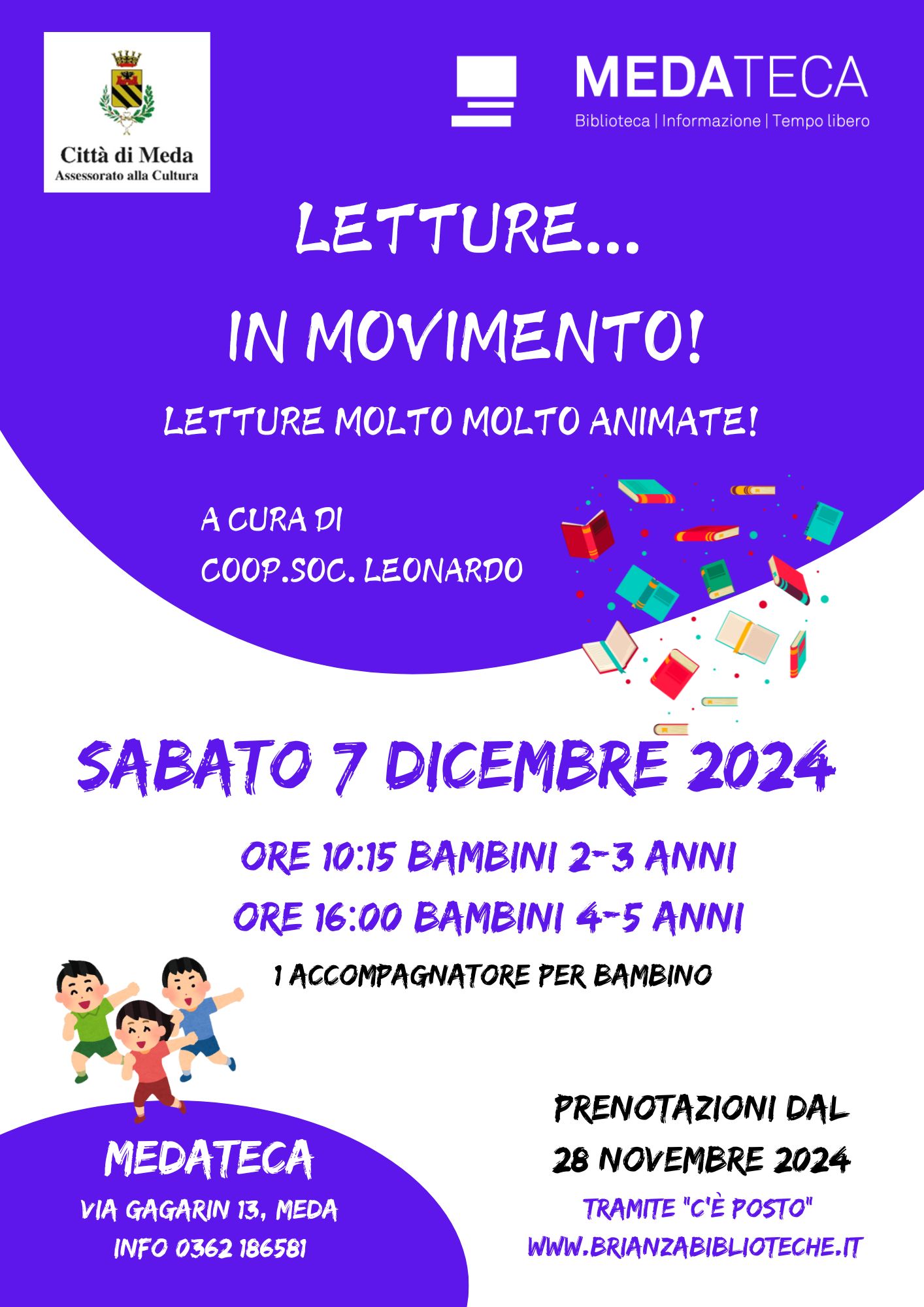 L'Assessorato alla Cultura e il personale della Medateca sono lieti di invitare bambine e bambini da 2 a 3 anni per delle letture molto molto animate a cura della Cooperativa Sociale Leonardo in programma sabato 07 dicembre 2024 presso la Medateca.