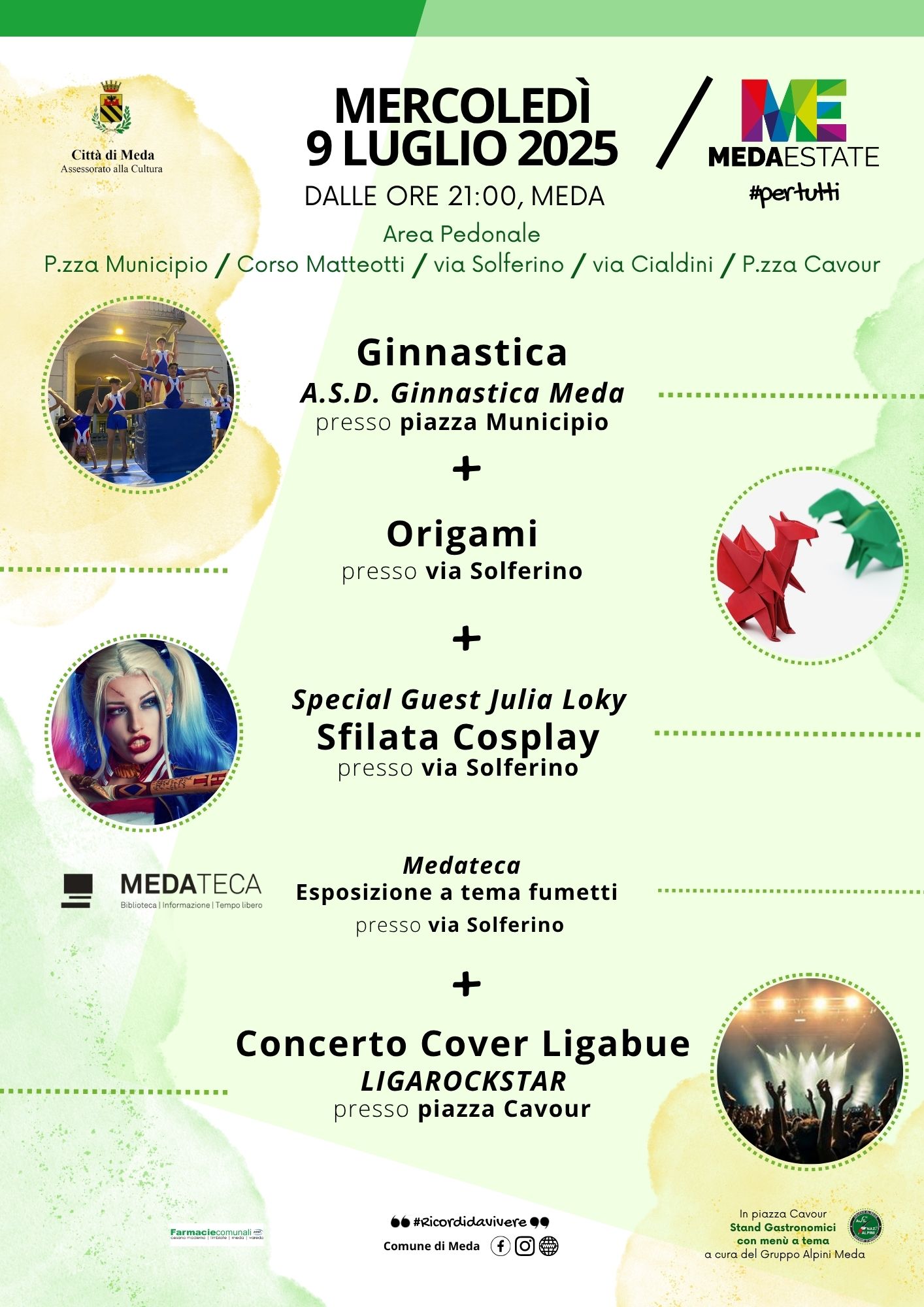 Dalle ore 21:00 il centro cittadino si anima con un’esplosione di eventi: esibizioni ginniche in piazza Municipio, laboratori e installazioni di origami in via Solferino, mostra fumetti a cura della Medateca, e l’imperdibile sfilata cosplay con la special guest Julia Loky. In piazza Cavour, musica dal vivo con la cover band Ligarockstar, tributo a Ligabue, e stand gastronomici a cura del Gruppo Alpini Meda.