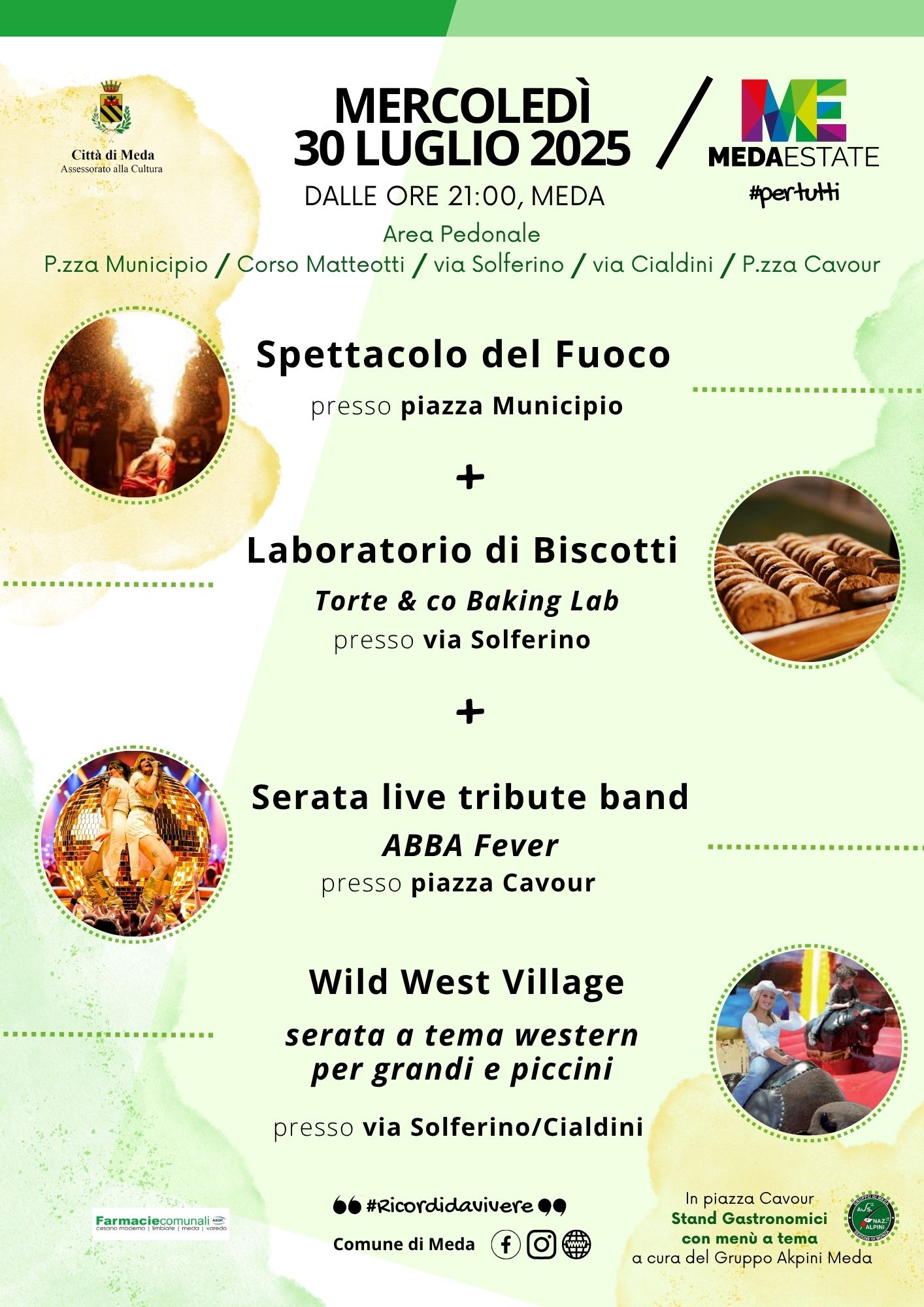 In luogo della già pubblicizzata esibizione del cantante Gionnyscandal – che sarà riprogrammata in futuro a causa di sopravvenute questioni di management – il programma della serata di mercoledì 30 luglio 2025 si arricchisce di eventi coinvolgenti per tutte le età. Dalle ore 21:00, il centro di Meda si trasforma in un grande palcoscenico a cielo aperto: tra le fiamme danzanti dello spettacolo del fuoco in piazza Municipio, i profumi del laboratorio di biscotti in via Solferino e l’energia esplosiva della mitica B For Dance, ce n’è per tutti i gusti! In piazza Cavour si balla con il live tributo “ABBA Fever”, mentre tra via Solferino e Cialdini prende vita il coloratissimo Wild West Village, con giochi e animazioni in stile western per grandi e piccini.