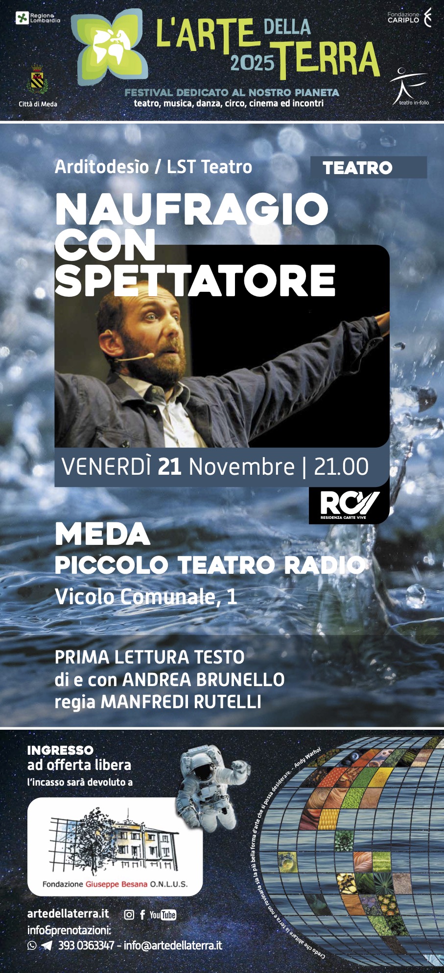 Nell'ambito del festival "L'ARTE DELLA TERRA 2025" a Meda, le compagnie Arditodesio / LST Teatro presentano "NAUFRAGIO CON SPETTATORE". Si tratta della prima lettura del testo, un evento che mette al centro il teatro di parola con l'attore Andrea Brunello, che ne cura la regia e l'interpretazione, affiancato dalla regia di Manfredi Rutello.