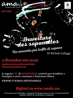 Evento a cura dell'Associazione "amaLO ETS" sabato 3 dicembre ore 16:00 presso l'Auditorium dell'Oratorio "San Giacomo" Spettacolo di bolle di sapone di Michele Cafaggi per bambini e famiglie