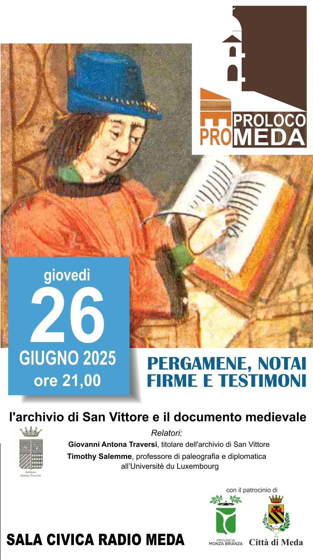 Giovedì 26 giugno 2025 alle ore 21.00, presso la Sala Civica Radio di Meda, si terrà l'incontro "Pergamene, notai, firme e testimoni", una serata dedicata alla scoperta dell’archivio di San Vittore e del documento medievale. Interverranno Giovanni Antona Traversi, titolare dell’archivio di San Vittore, e Timothy Salemme, professore di paleografia e diplomatica all’Università di Luxembourg.